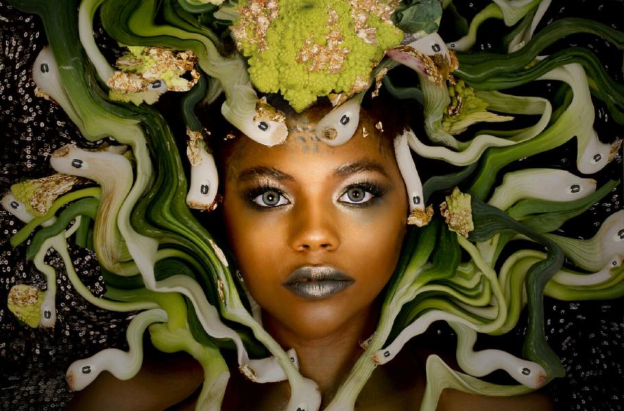 Mytologická Medúsa byla potrestána bohyní Athénou za svou opovážlivost. Dcera nejvyššího boha Medúsu potrestala tím, že její vlasy proměnila v hady a kdokoliv na ni pohlédl na místě zkameněl. Pohled na dílo Britky Emmy Dunhamové naopak potěší oko každého milovníka zeleniny – divoký účes její Medúsy je totiž vytvořený z pórku, jarní cibulky, romanesca (druh květáku) a vigny čínské. (foto: FPotY)