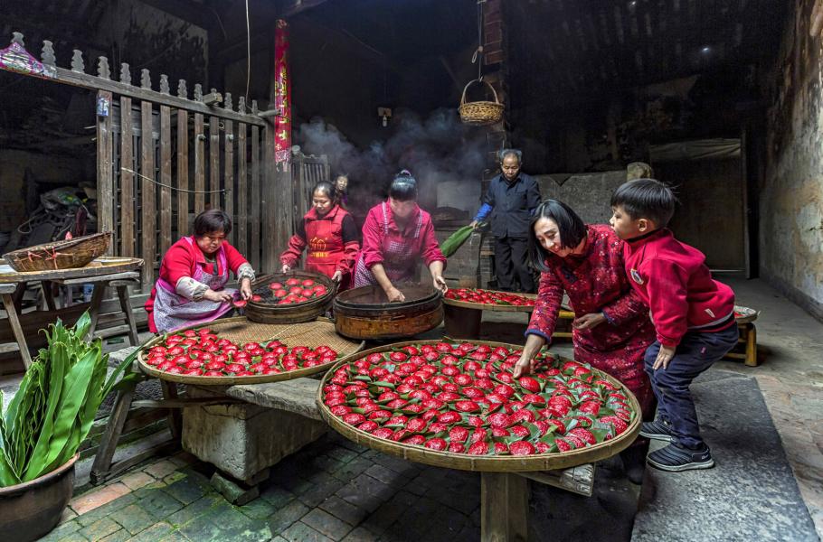 Rodiny v čínské provincii Fu-ťien se při oslavách nového lunárního roku scházejí nad červenými knedlíčky plněnými rýží či mungo fazolemi. Před napařením je pomocí speciálních razítek potisknou znaky „bohatství“ nebo „štěstí“ a doufají, že tím své rodině zajistí lepší budoucnost. (foto: FPotY)