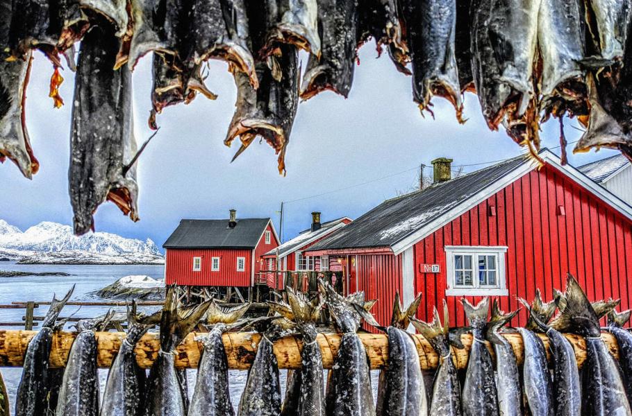 Na norském souostroví Lofoty se dřevěné konstrukce na sušení ryb staly nedílnou součástí krajiny. Panují tam totiž ideální podmínky lehce pod bodem mrazu, v nichž se například oblíbené tresky nemusejí nasolovat ani udit – stačí je nechat venku. (foto: FPotY)