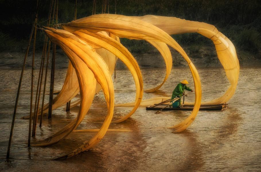 Čínská provincie Fu-ťien proslula coby nejsvéráznější a zároveň nejmalebnější rybářská oblast asijské velmoci. Má dlouhé pobřeží i velmi čisté vody, takže se ideálně hodí pro rybolov či pěstování řas. Snímek zachycuje sítě visící do řeky, jimiž povlává vítr. (foto: FPotY)