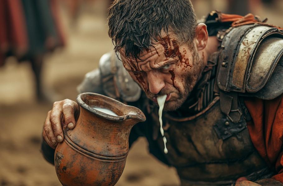 Ve starém Římě se mléko nepilo. Bylo považováno za poněkud nechutnou surovinu vhodnou jen k výrobě sýrů. (ilustrace: Midjourney AI, PDM 1.0)