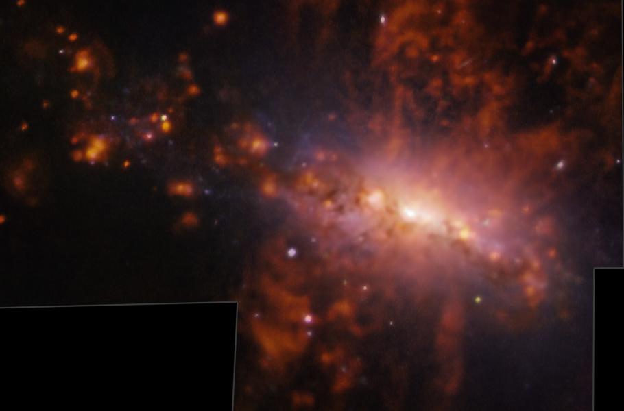 Detailní pozorování galaxie NGC 4383 odhalilo masivní výtrysk hmoty, který vznikl v důsledku extrémních explozí hvězd v centrální části galaxie.