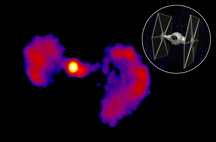 Astronomové nedávno pozorovali jednu velmi zajímavou aktivní galaxii, která má v oblasti rádiového záření velmi povědomý tvar. Až neskutečně připomíná ikonickou stíhačku TIE (anglicky „TIE Fighter“), která je asi nejznámější kosmickou lodí Imperiální flotily ze světa Hvězdných válek.