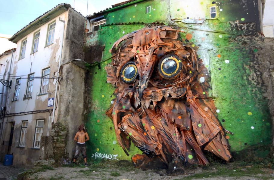 Portugalský umělec tvořící pod jménem Bordalo II se narodil v roce 1987 a svou generaci vnímá jako vrcholně konzumní. Na bezohlednost a chamtivost, které vládnou světu, se pokouší ukázat pouličním uměním vznikajícím z odpadků. Volbou materiálu upozorňuje na nutnou udržitelnost a oživuje přírodu prostředky její destrukce. (foto: Profimedia)