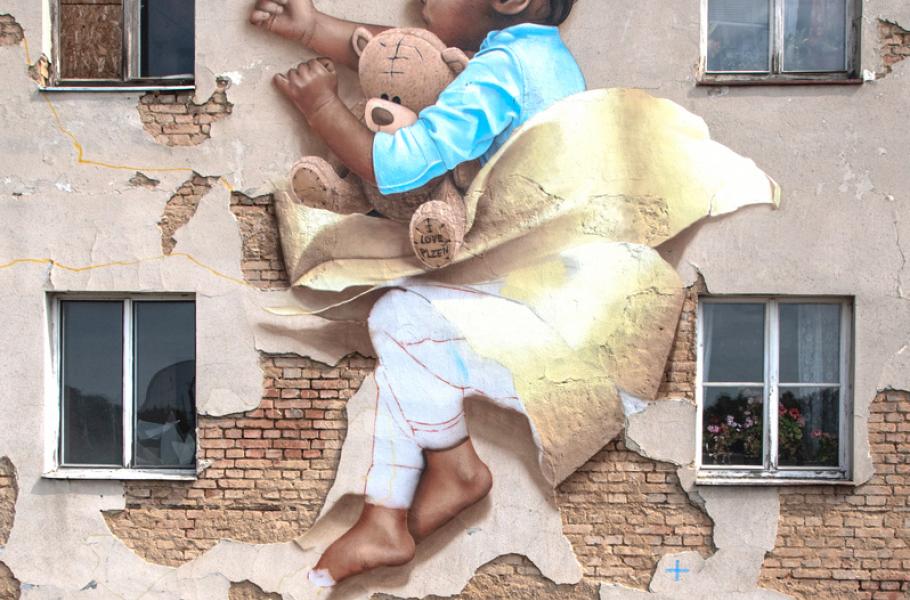 Dítě přikryté odloupnutou omítkou vzniklo během festivalu WALLZ, který se konal letos v Plzni. Dílo se nachází na bytovém domě v Jateční ulici a podepsal se pod něj tvůrce vystupující jako Chemis – český umělec, jenž se tvorbě graffiti věnuje již od šestnácti let. (foto: Profimedia)