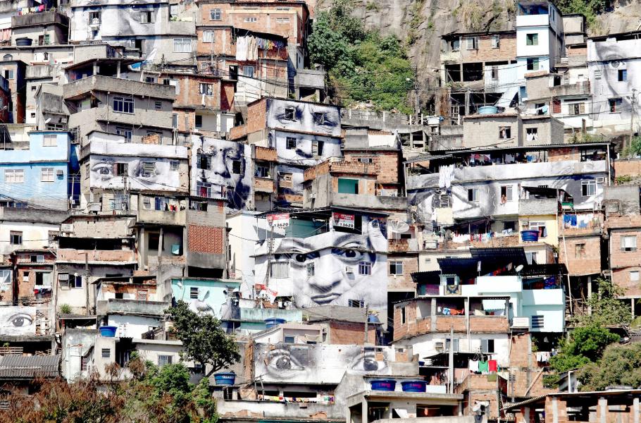 Projekt „Ženy jsou hrdinky“ má poukázat na bezpráví, kterému ženská část populace čelí. Umělec JR nafotil Brazilky žijící v těžkých podmínkách favely Morro da Providencia v Rio de Janeiru a upravené snímky spolu s kolegy zvěčnil na fasádách. Slum tak nyní doslova proniká do duše sžíravým pohledem. (foto: Profimedia)