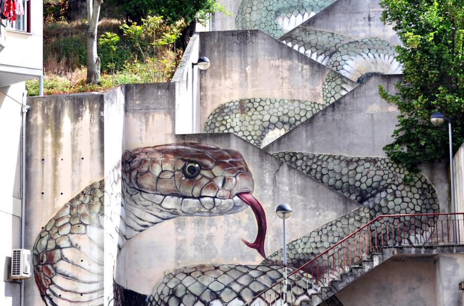 Portugalská Guarda leží v nadmořské výšce přes tisíc metrů a tamními ulicemi se vine bezpočet schodišť. Španělský umělec SFHIR, který tvoří pomocí kombinace různých technik a zároveň zástavbu využívá k optickým iluzím, si ve městě vybral stupňovité schody a obsadil je obřím hadem. Dílo se navíc doplňuje se starší kresbou dívky, která nahoře čeká se zlatou halapartnou. (foto: Pixabay, CC0)