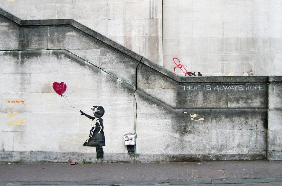 Banksy je zřejmě nejslavnějším graffiti umělcem planety a jeho nejznámější práce se jmenuje Dívka s balonkem. V podstatě jednoduché dílko zachycuje holčičku, která se natahuje pro balonek ve tvaru srdce unášený větrem. Britové popsaný výjev v roce 2017 zvolili nejoblíbenějším uměleckým dílem a o dva roky dřív se přenesené na plátno prodalo v přepočtu za 1,6 milionu korun. (foto: Wikimedia Commons, Dominic Robinson, CC BY-SA 2.0)
