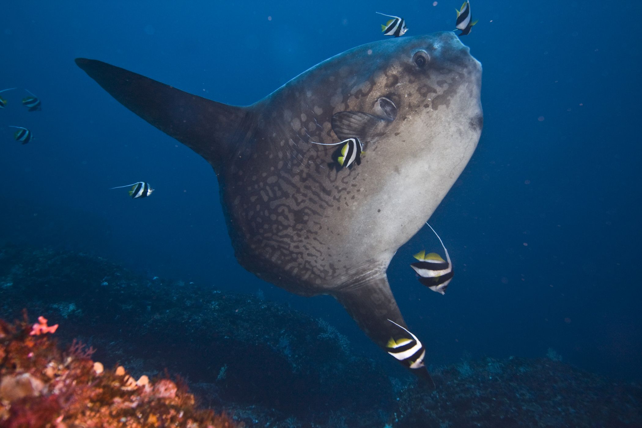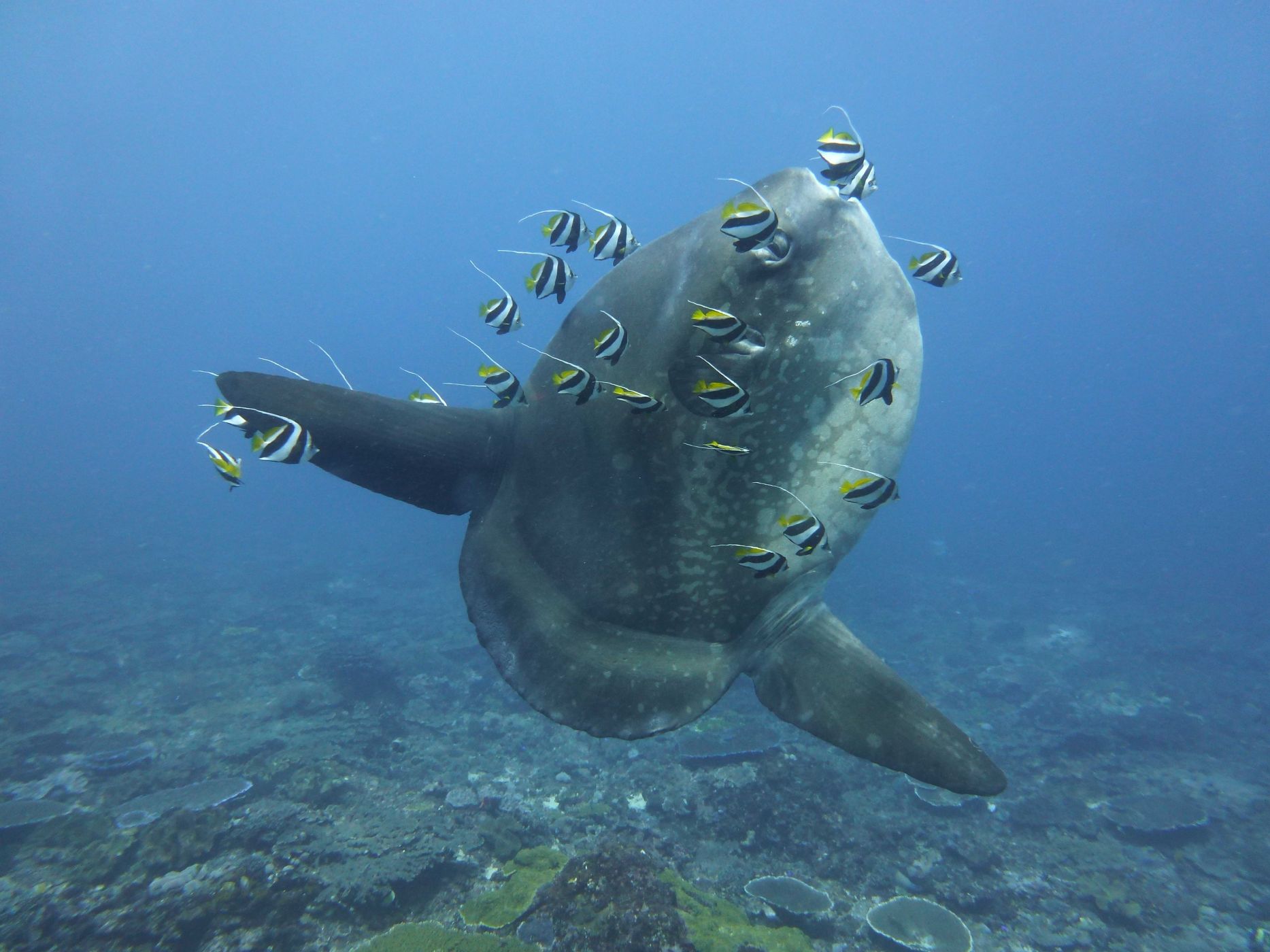Obří měsíčníky často doprovázejí drobní čističi, kteří velkým rybám pomáhají odstranit parazity