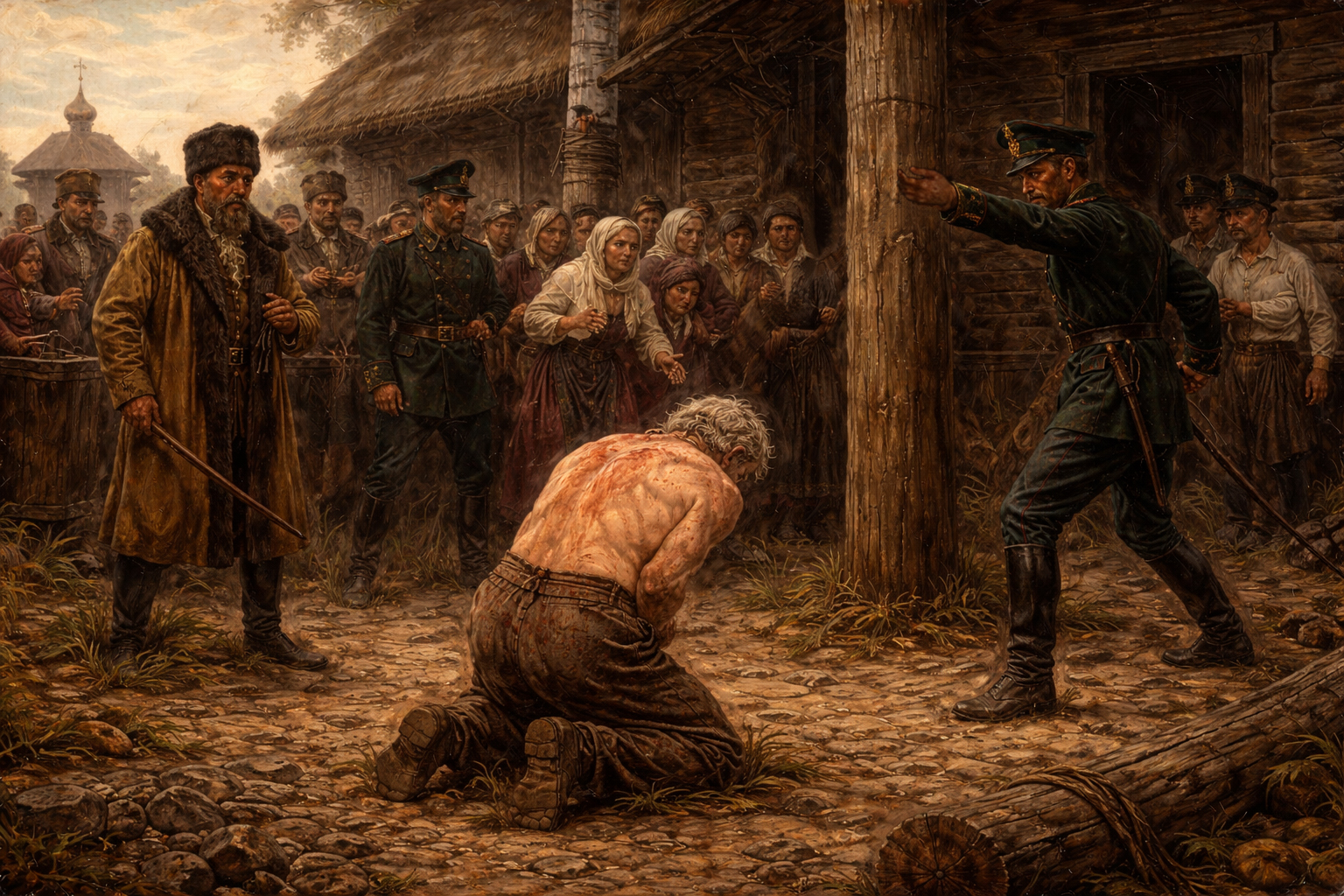 Život v předrevolučním Rusku byl spoutaný přísnou morálkou. Chování, které vybočovalo z řady, bylo přísně trestáno. (ilustrace: ChatGPT, PDM 1.0)