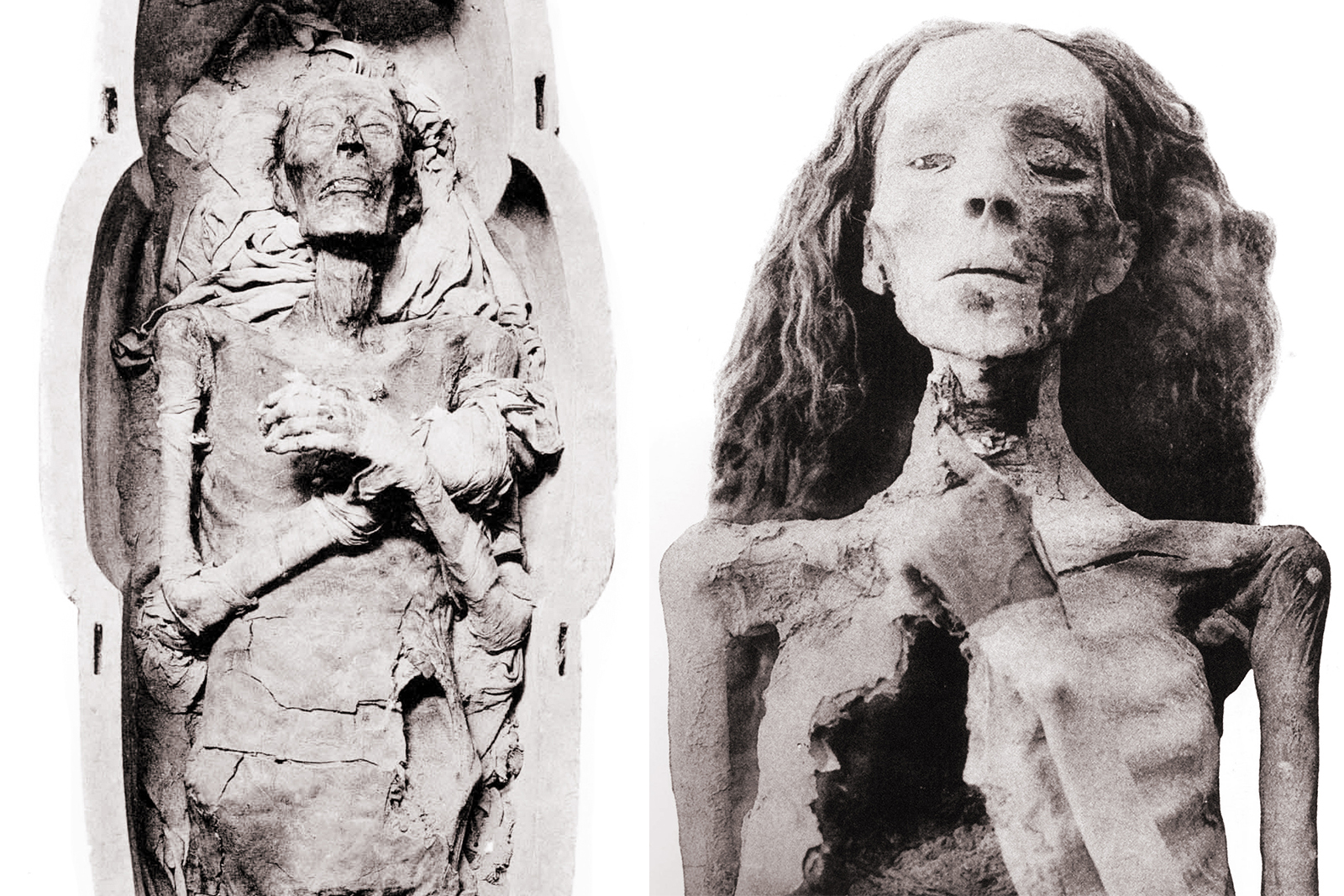 Mumie Ramesse II. nalezená v Dér el Bahrí (vlevo) a pravděpodobná Tutanchamonova matka (vpravo).