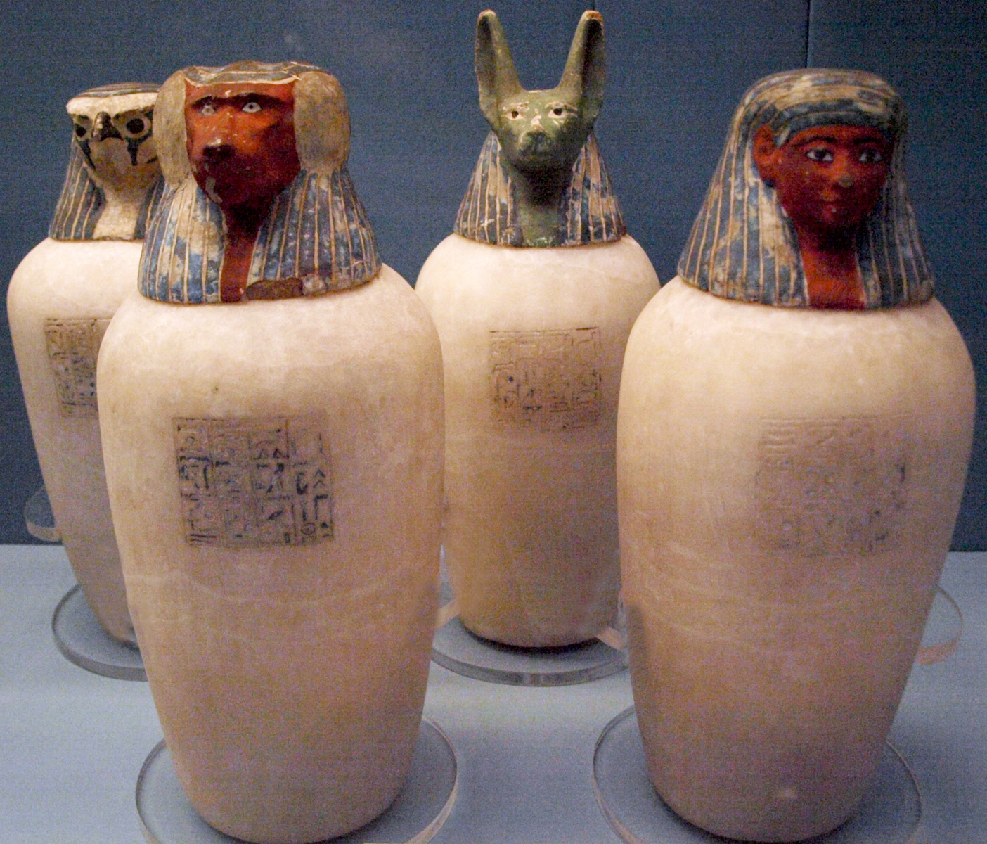 Ve skrýši v Dér el Bahrí se našly například tyto nádoby na vnitřnosti zvané kanopy, jejichž obsah patřil manželce hodnostáře Pinodžema.