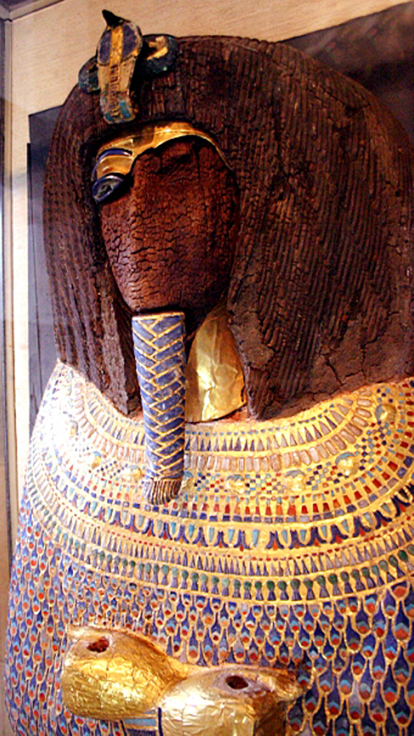 Sarkofág s odlomenou zlatou maskou z hrobky KV 55, který snad patří Achnatonovi.