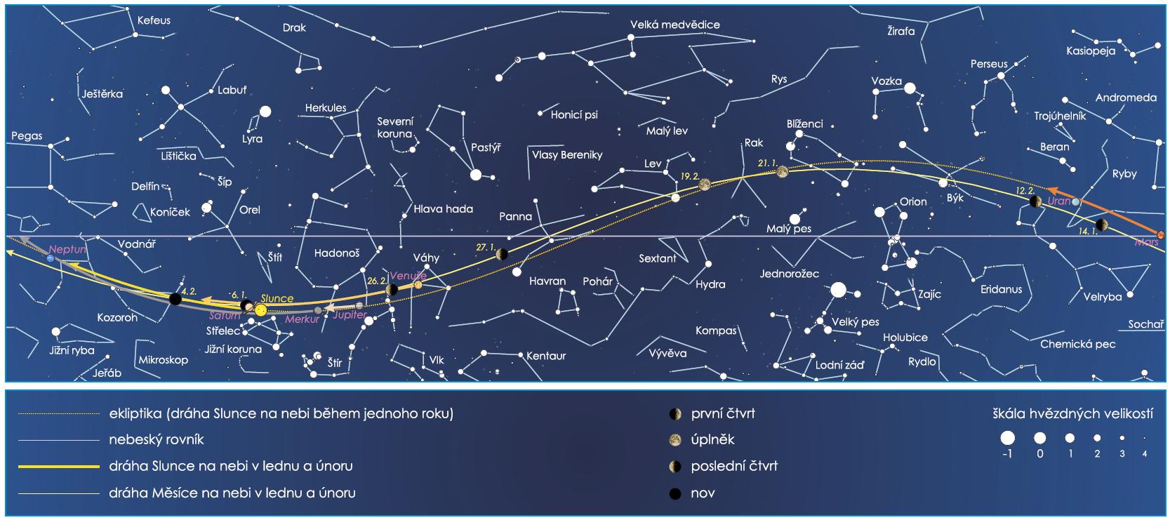 Obdélníková mapa uvádí přibližné polohy významných těles Sluneční soustavy na únorovém nebi.