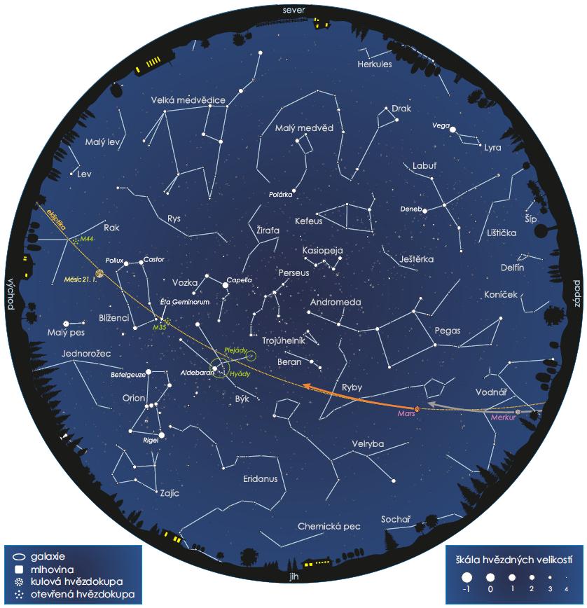 Kruhová mapa zobrazuje podobu únorového nočního nebe