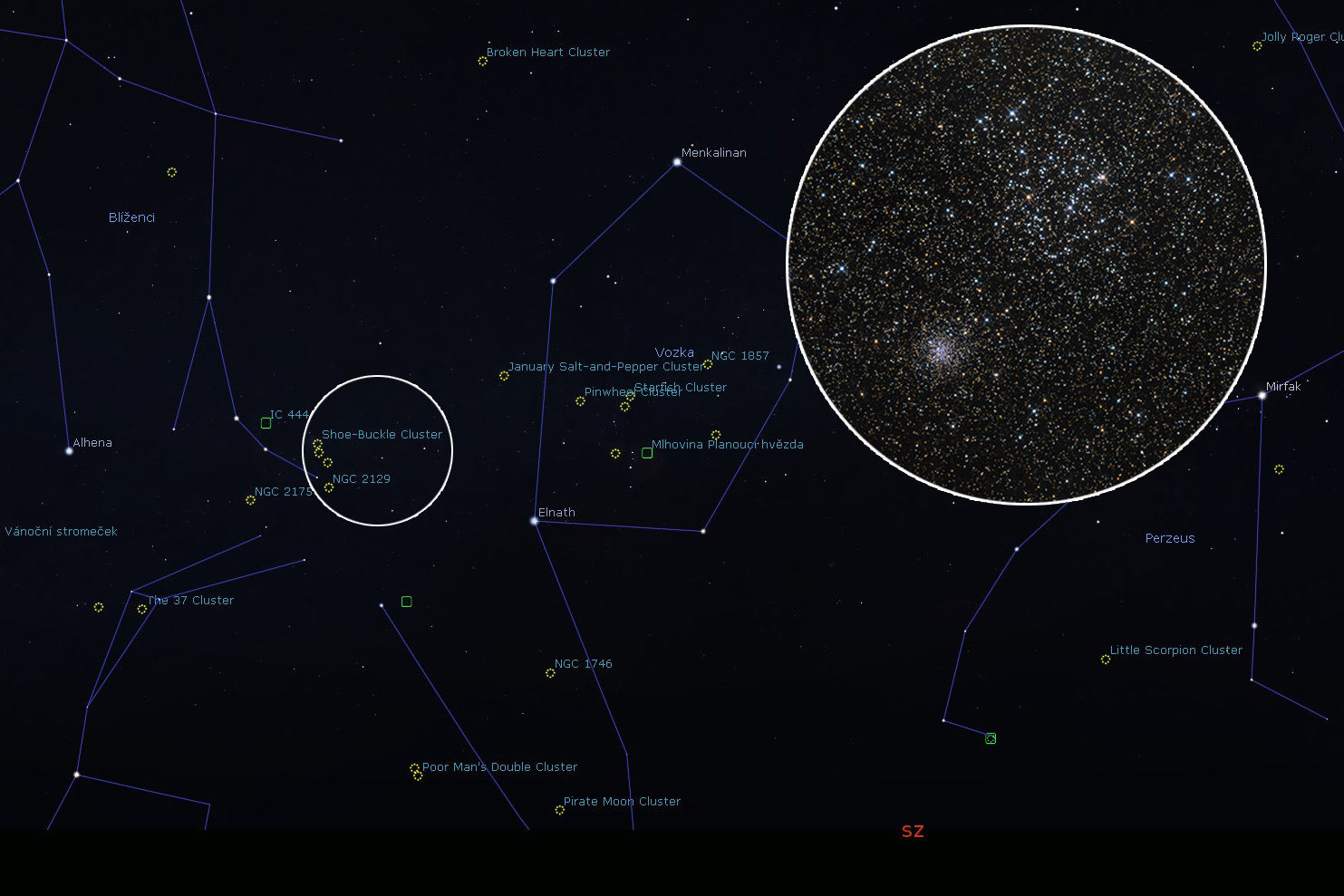 Majitelé dalekohledů si ale mohou udělat výlet za méně jasnými objekty zimního nebe. Pro pozorovatele s triedry se nabízí třeba hezká otevřená hvězdokupa M35 (NGC 2168) ze souhvězdí Blíženců, která je na hranici viditelnosti očima.