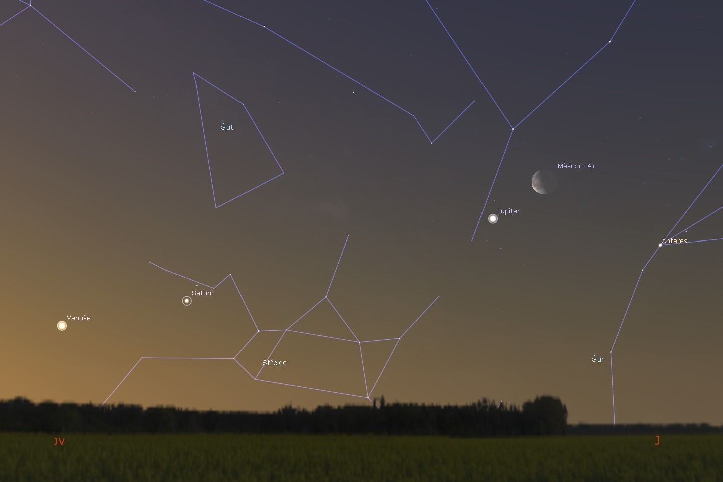 Na konci února (27. a 28. 2.) bude k vidění zajímavé seskupení Měsíce, Jupitera, Saturnu, Venuše a jasné hvězdy Antares ze souhvězdí Štíra na ranním nebi nad jihovýchodem.