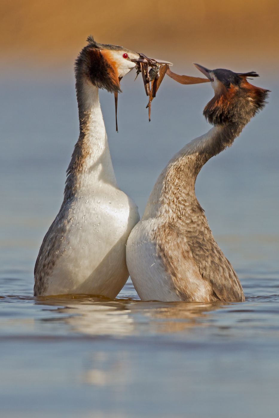 Charakteristická póza zásnubních tanců potápek roháčů. Tito ptáci jsou skvěle přizpůsobeni životu ve vodním živlu. Na souši působí velmi nemotorně a navštěvují ji jen výjimečně a neradi.