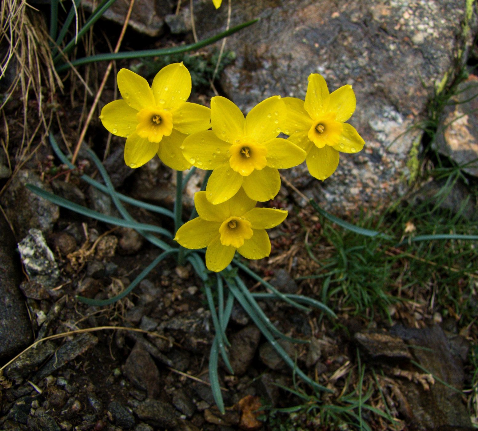 Půvabný Narcissus rupicola (který nemá český název) ještě s kapkami vody po dešti