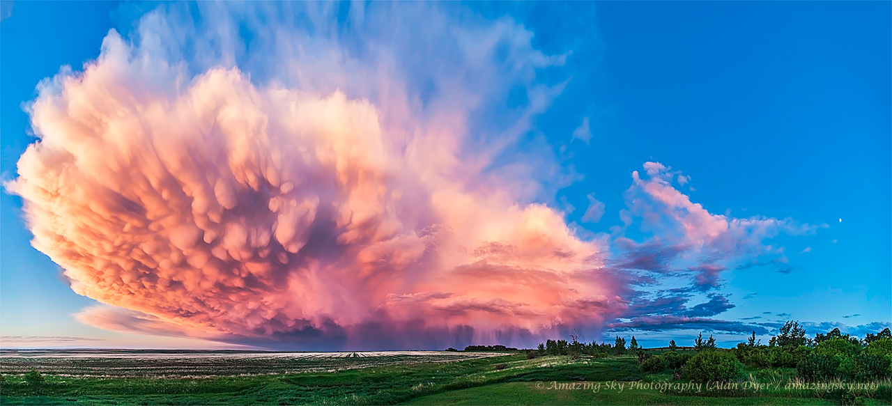 Tento ustupující cumulonimbus, kterému se běžněji říká bouřkový mrak, je poněkud neobvyklý. Na svém bližším konci totiž obsahuje neovyklé výstupky mraku mammatus a ze vzdálenějšího konce zároveň prší.