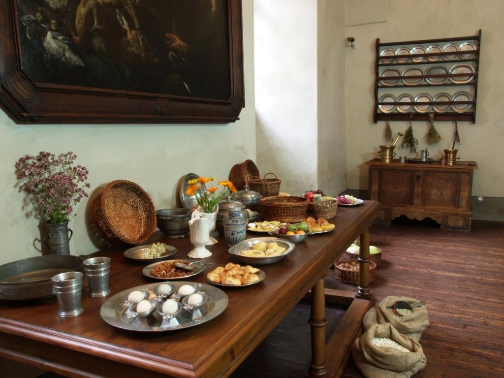 Přípravna jídel v zámku v Třeboni. Zde se jídla servírovala na tácy, aby pach z kuchyně nerušil hosty