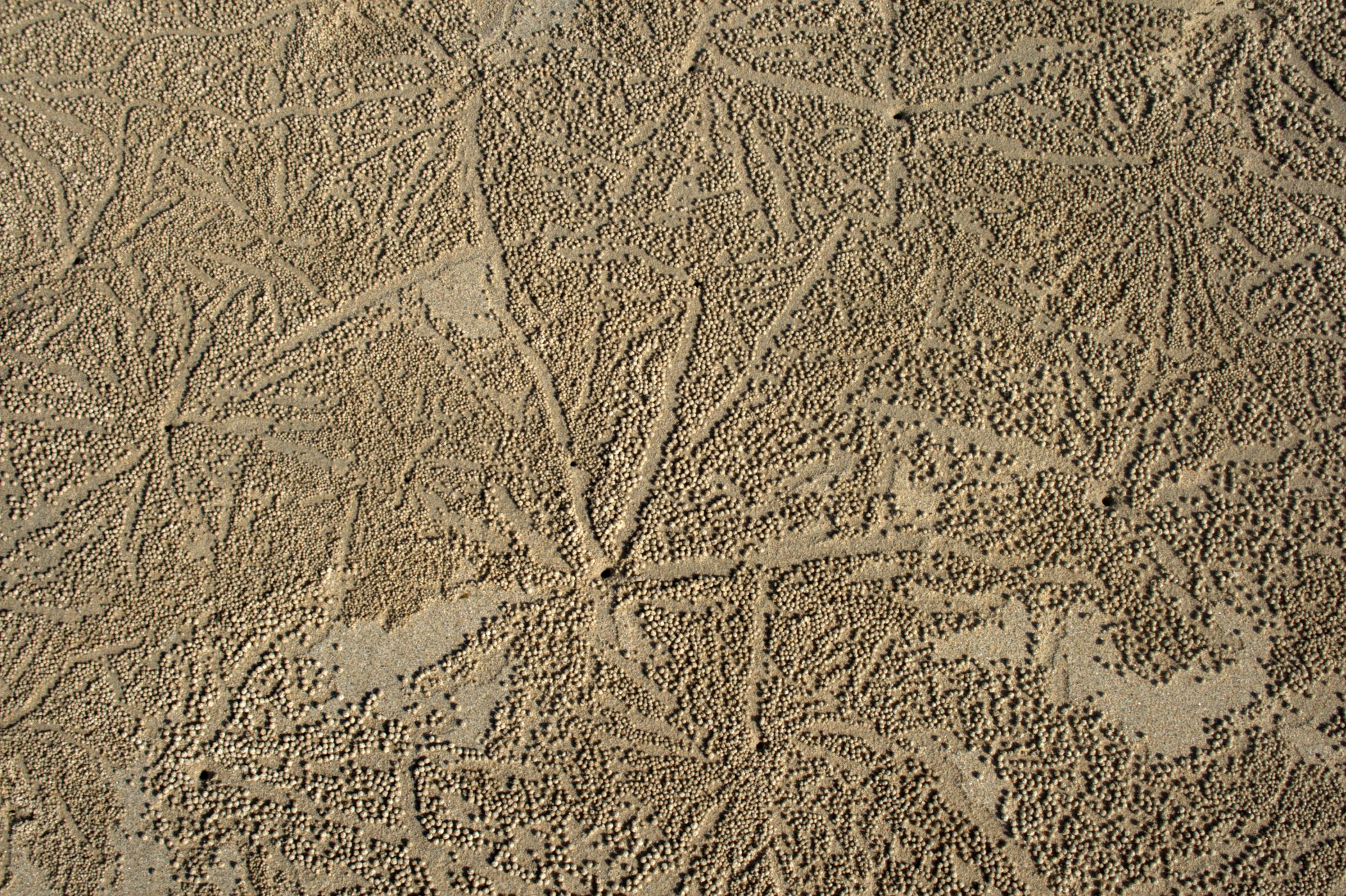 • Ornamenty z pískových kuliček, které na pláži vytvářejí krabi rodu Scopimera.