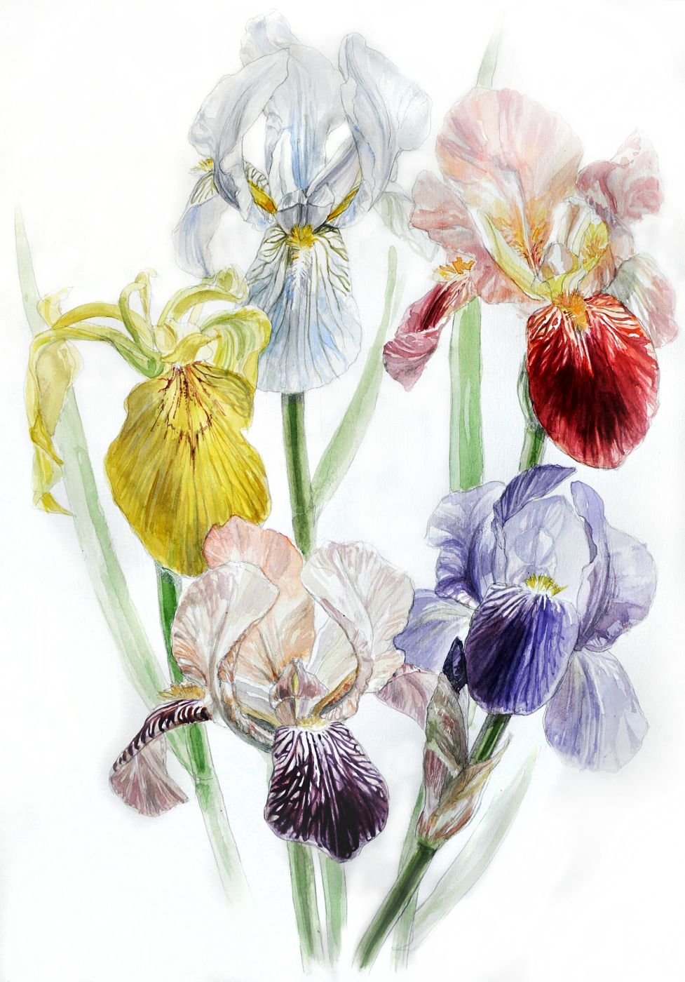 Žlutý květ - kosatec žlutý (Iris flavescens), bílý květ - kosatec florentský (Iris germanica ´Florentina´), červenorůžový - kosatec bezový (Iris sambucina), modrofialový - kosatec německý (Iris germanica), červenofialový - kosatec červenofialový (Iris squalens)