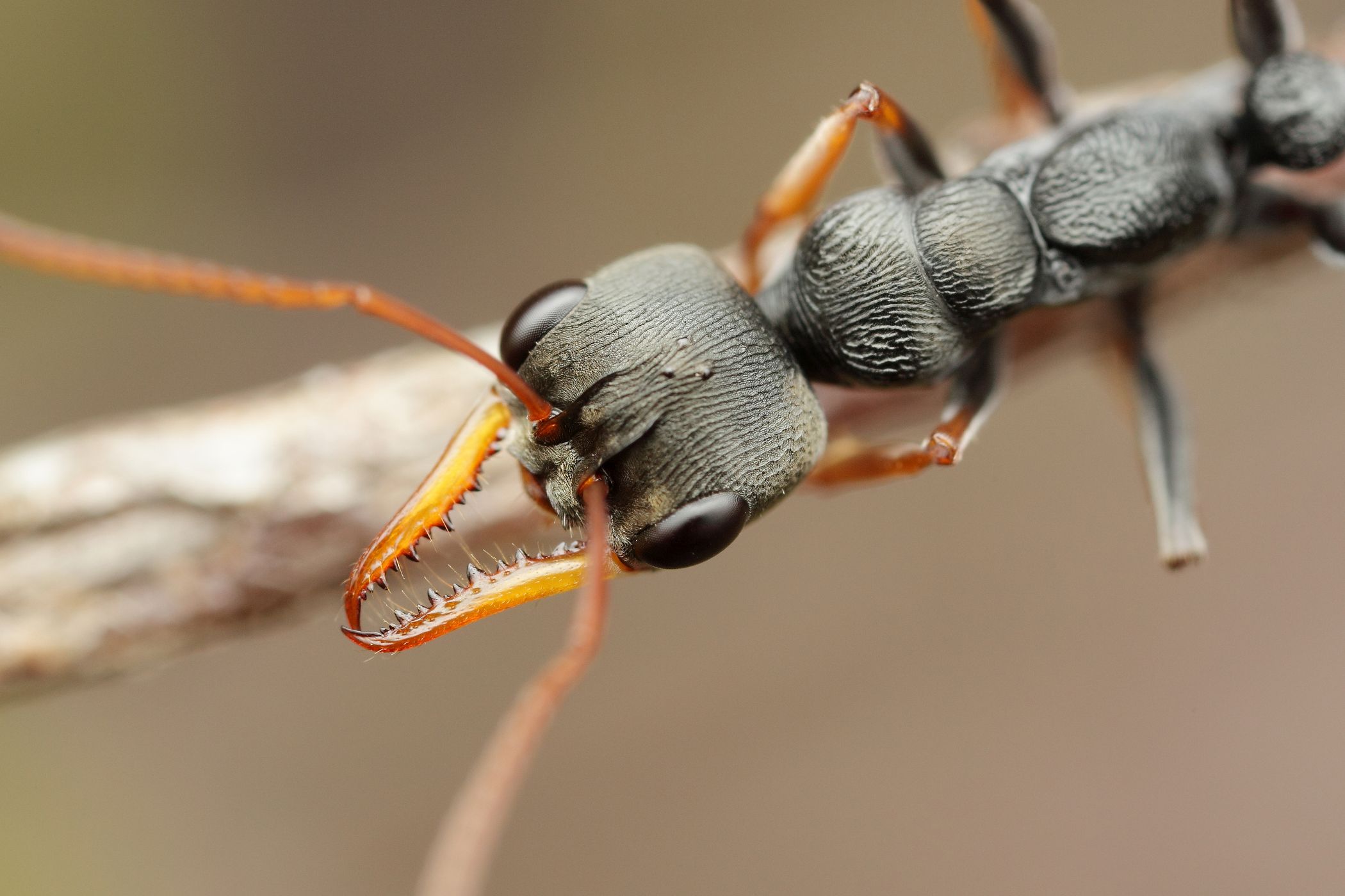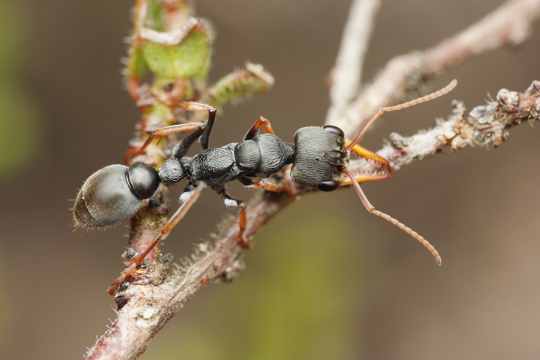 Jeden z největších druhů australských mravenců, buldočí mravenec druhu Myrmecia pyriformis s ulovenou včelou. Mravenci svou kořist nejprve sevřou svými mohutnými kusadly a po té jí uštědří smrtící žihadlo.