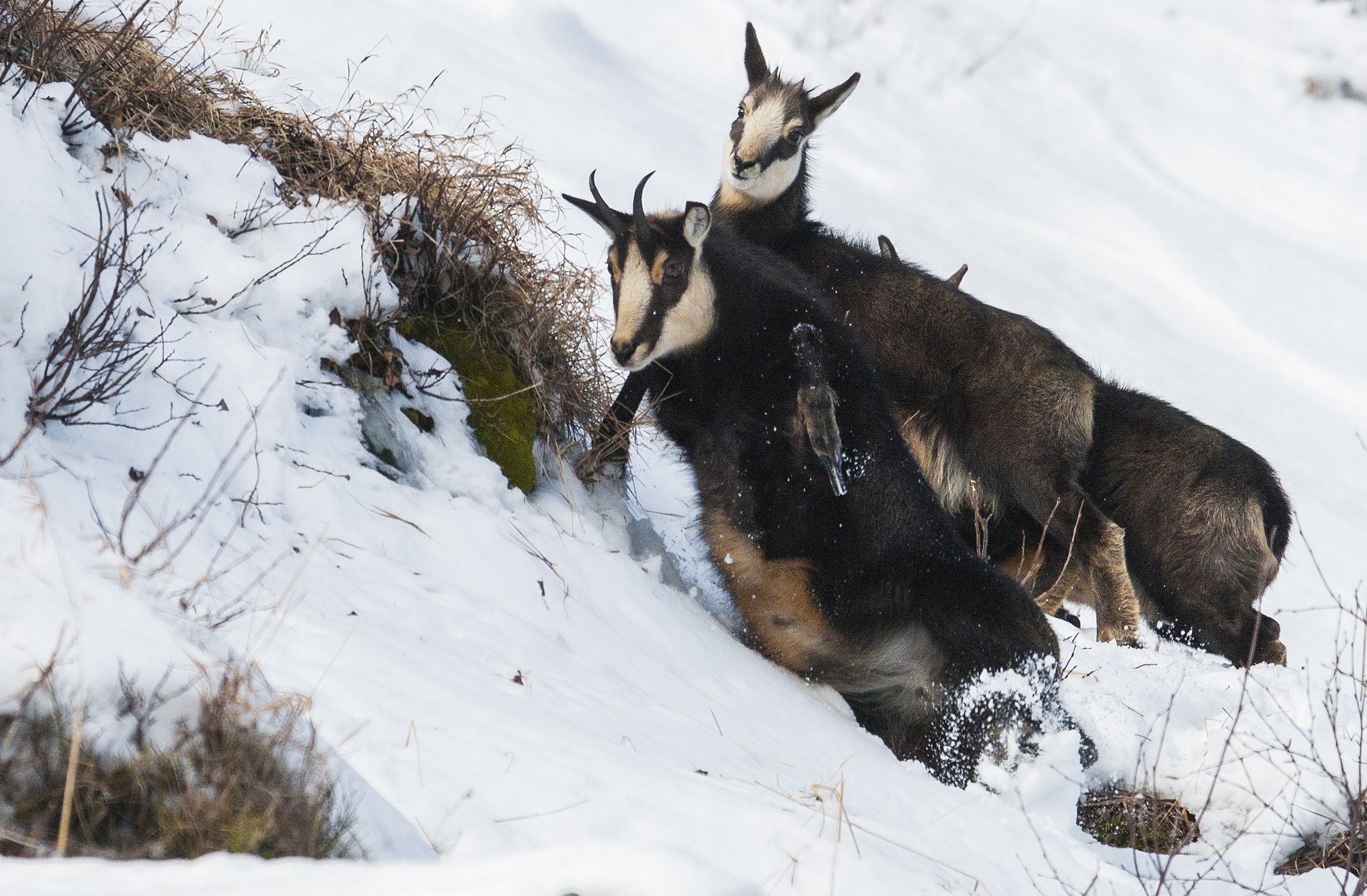Boj o život – kamzice s kamzíčaty na kluzkém svahu v zimní srsti.