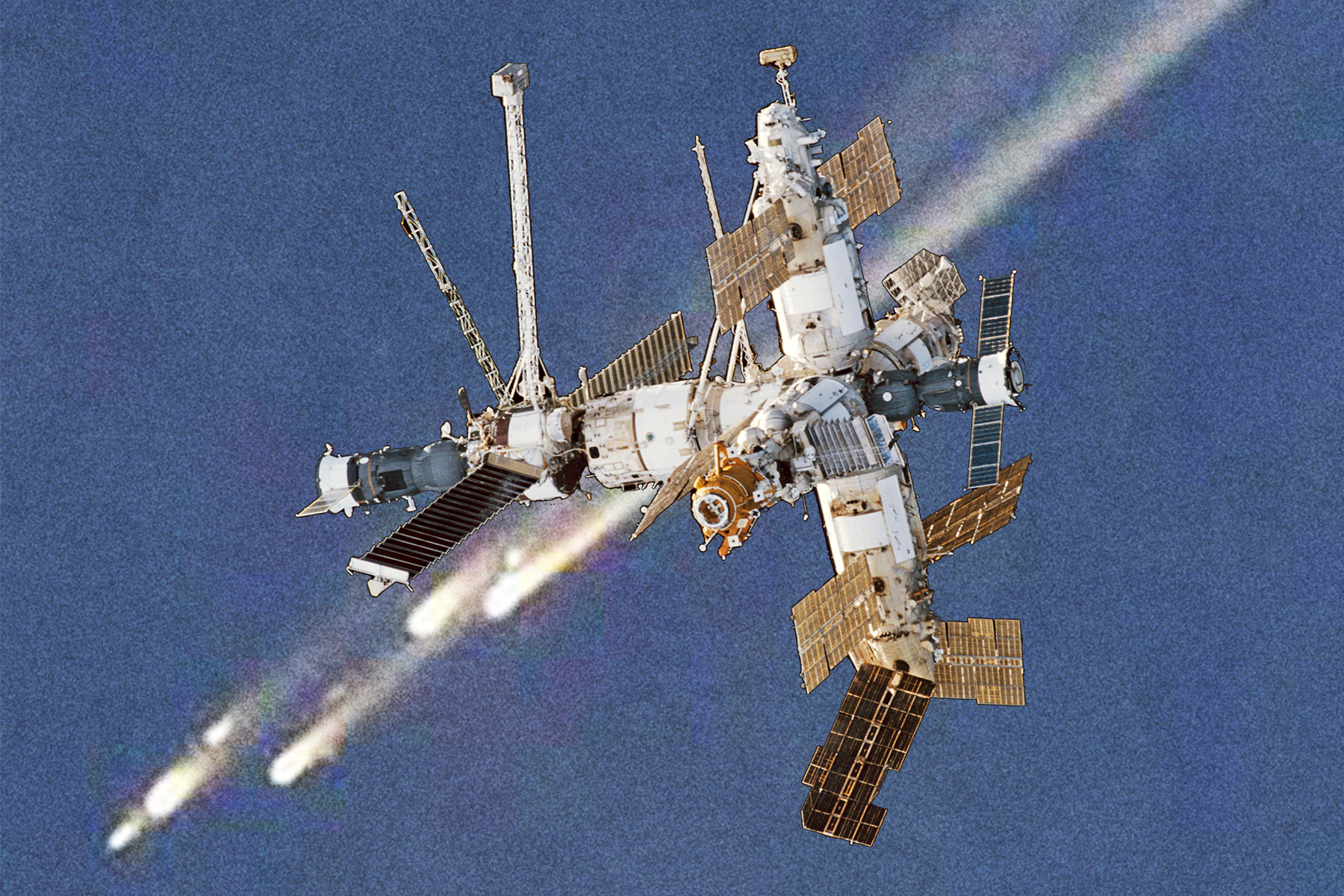 Orbitální základna, jak ji v únoru 1998 viděli astronauti v odlétajícím raketoplánu Endeavour. V pozadí zánik stotřicetitunové stanice v zemské atmosféře, 23. března 2001.