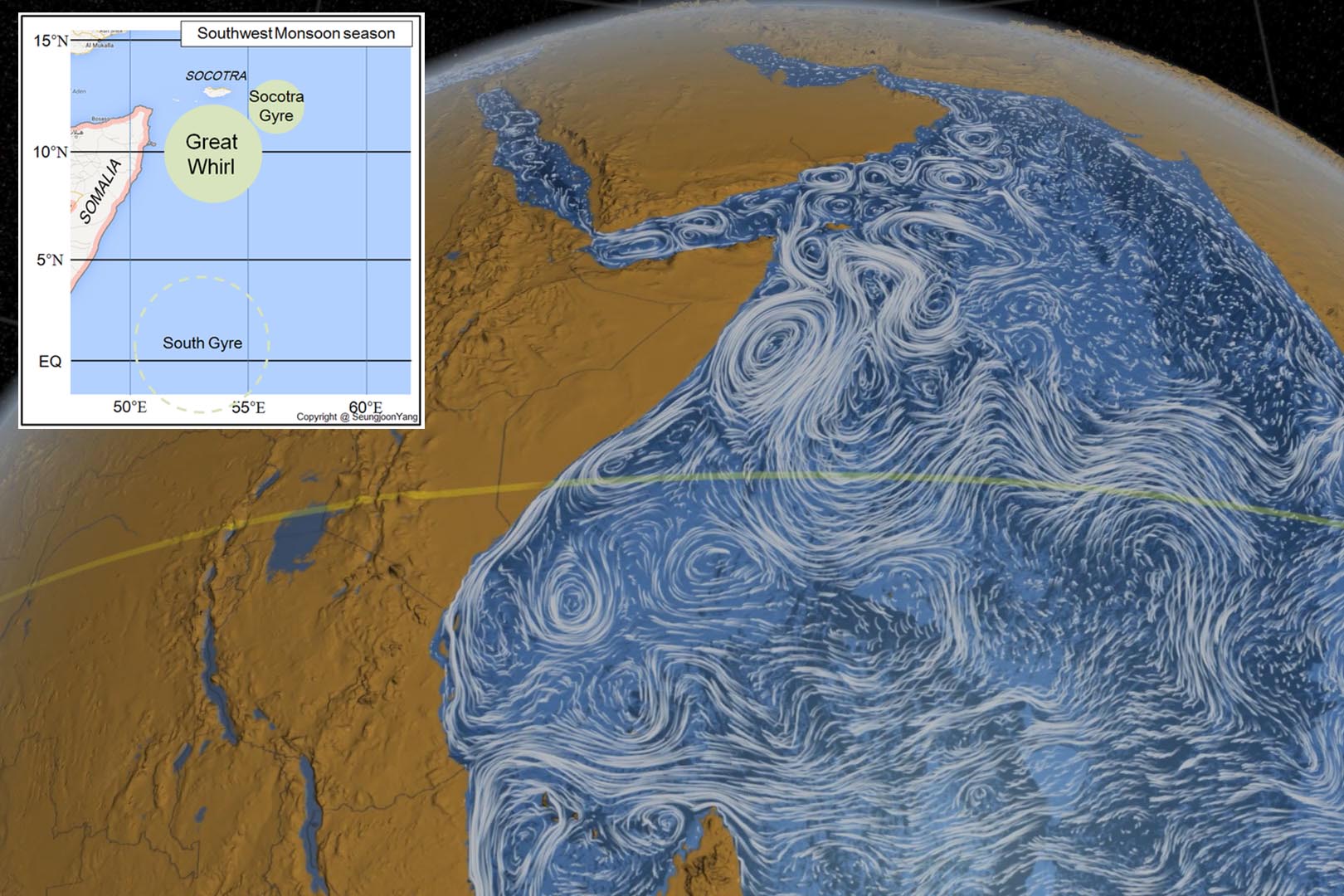 Mořské proudy znázorněné na satelitním snímku Indického oceánu z roku 2006.