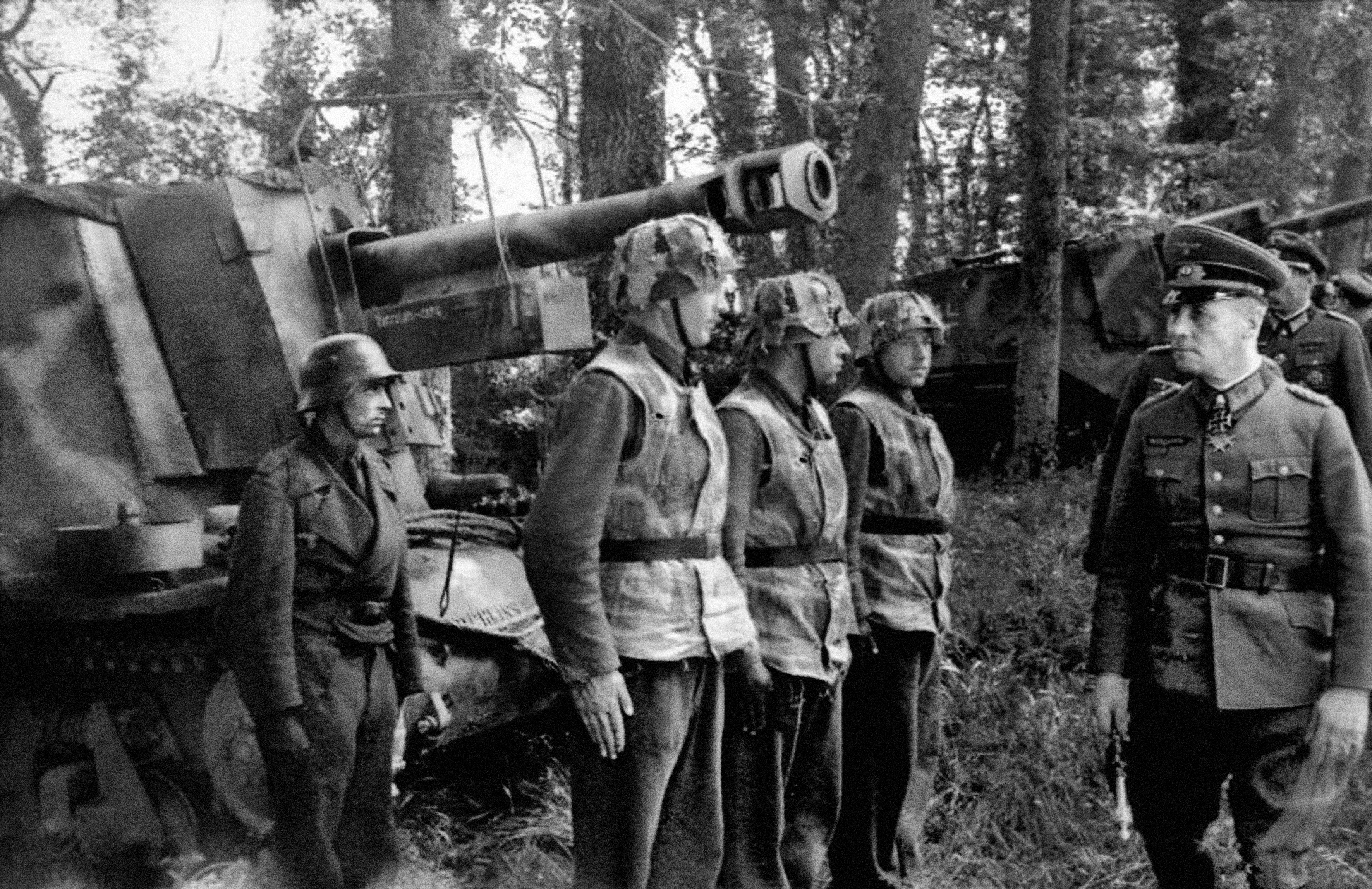 Erwin Rommel při inspekci obsluh samohybných houfnic 21. tankové divize. Šlo o jedinou německou obrněnou formaci, která se 6. června mohla zapojit do boje