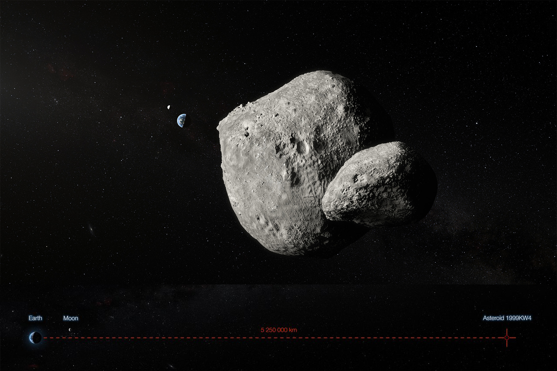 Vizualizace ukazuje obě složky dvojplanetky 1999 KW4.