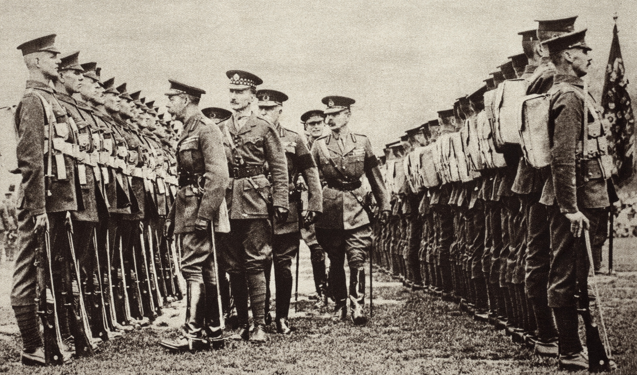 Král Jiří V. na inspekci rekrutů, kteří zanedlouho zamíří na západní frontu. Za panovníkem stojí Horatio Kitchener.