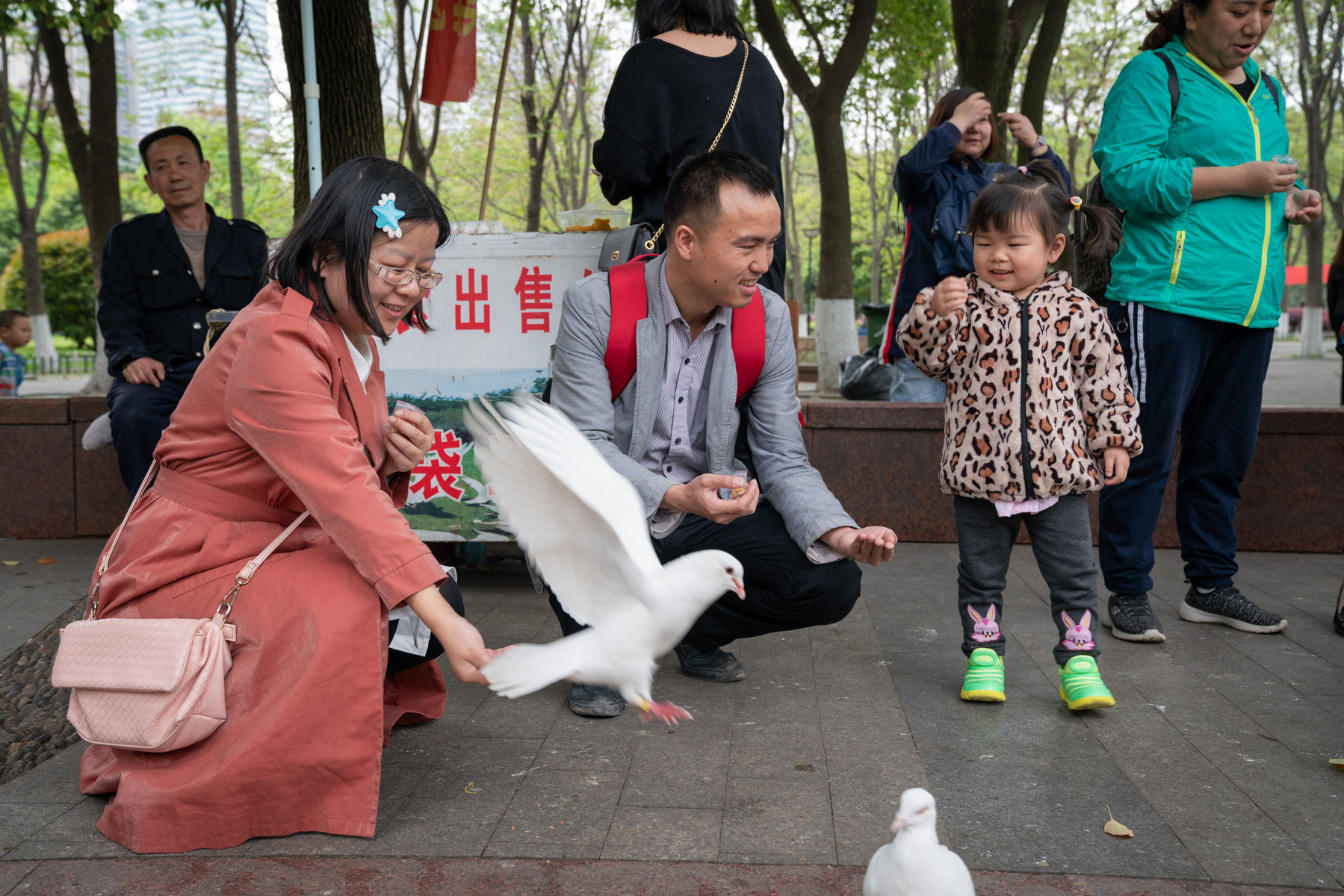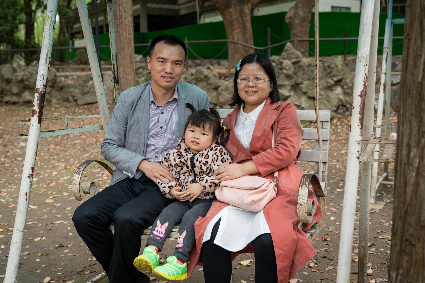 Ceng Jou-lin s manželem Čou Tong-jüanem a dcerkou Čang Jüe-wej si užívají volné chvíle v parku ve Wu-chanu.