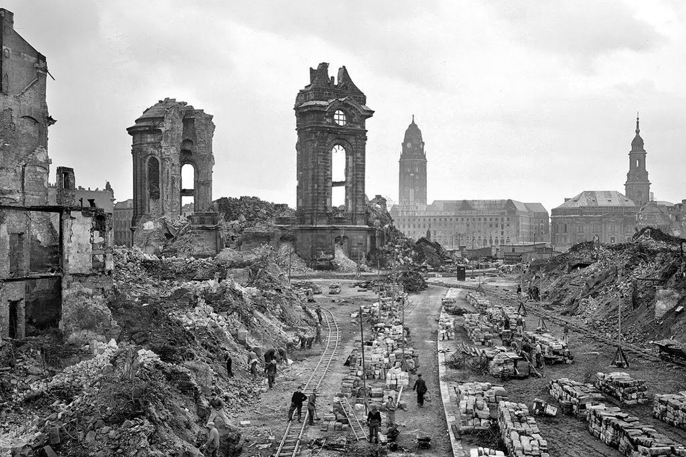 Po náletech za druhé světové války zůstala z drážďanského kostela Panny Marie jen hromada suti. Rekonstrukce se odehrála v letech 1994–2004.