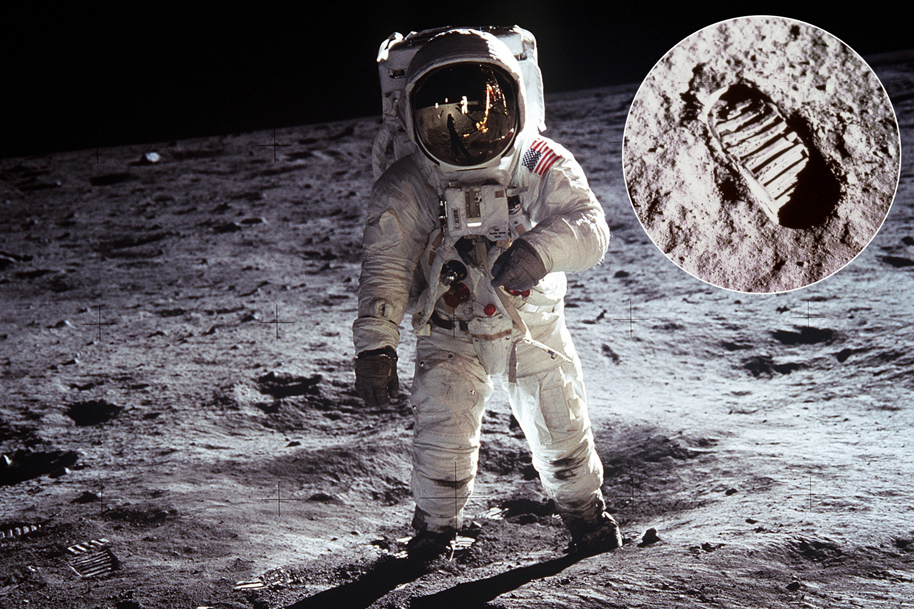 Otazníky vyvolal i snímek, v němž se v helmě Buzze Aldrina zdánlivě zrcadlí dvě postavy.