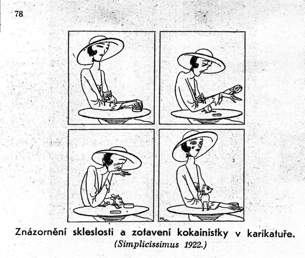 Dobová karikatura: znázornění skleslosti a zotavení kokainistky