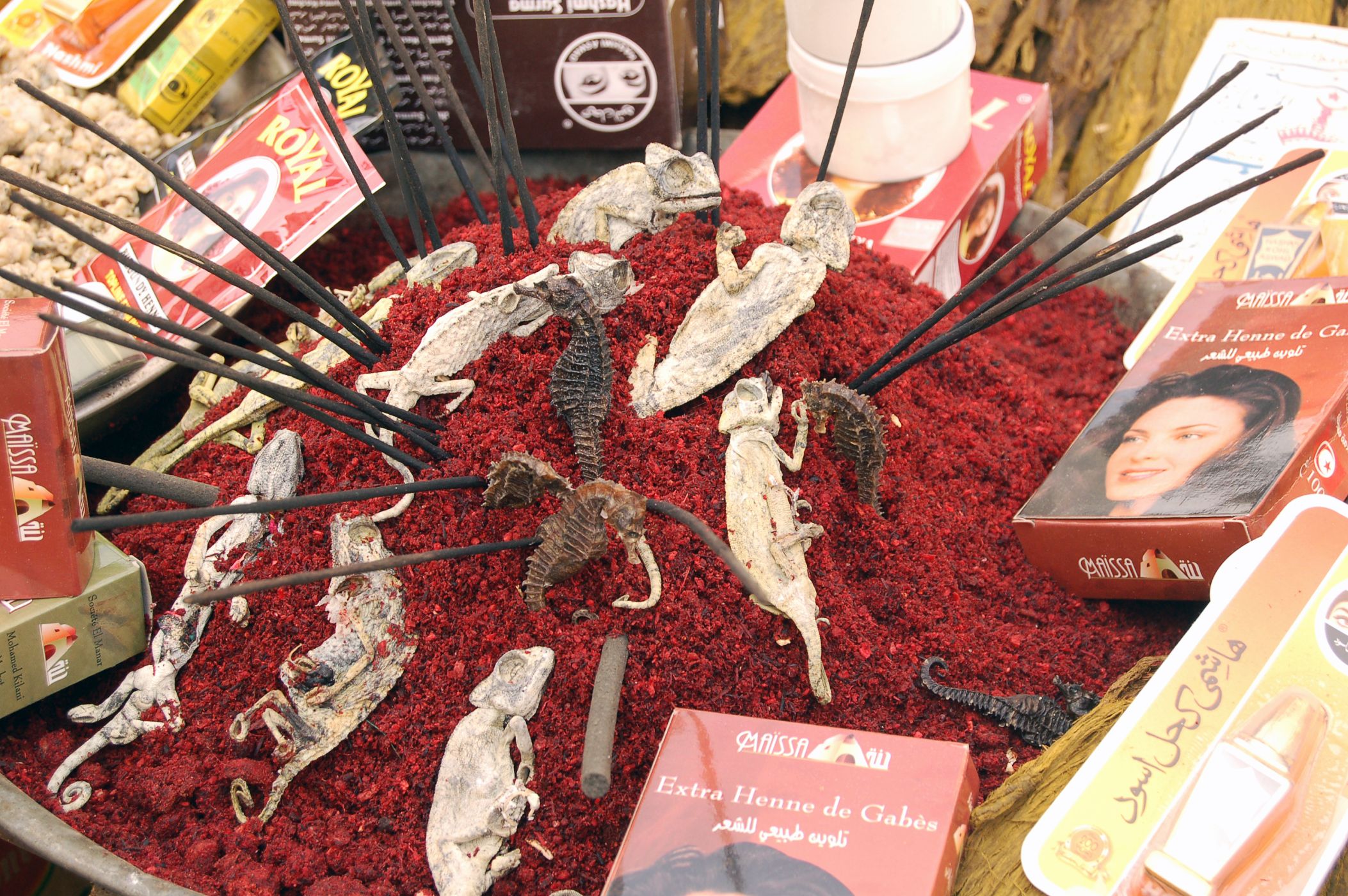 • Sušení chameleoni na tuniském tržišti. Kromě chameleonů lze koupit sušené mořské koníky a další koření a bylinky.