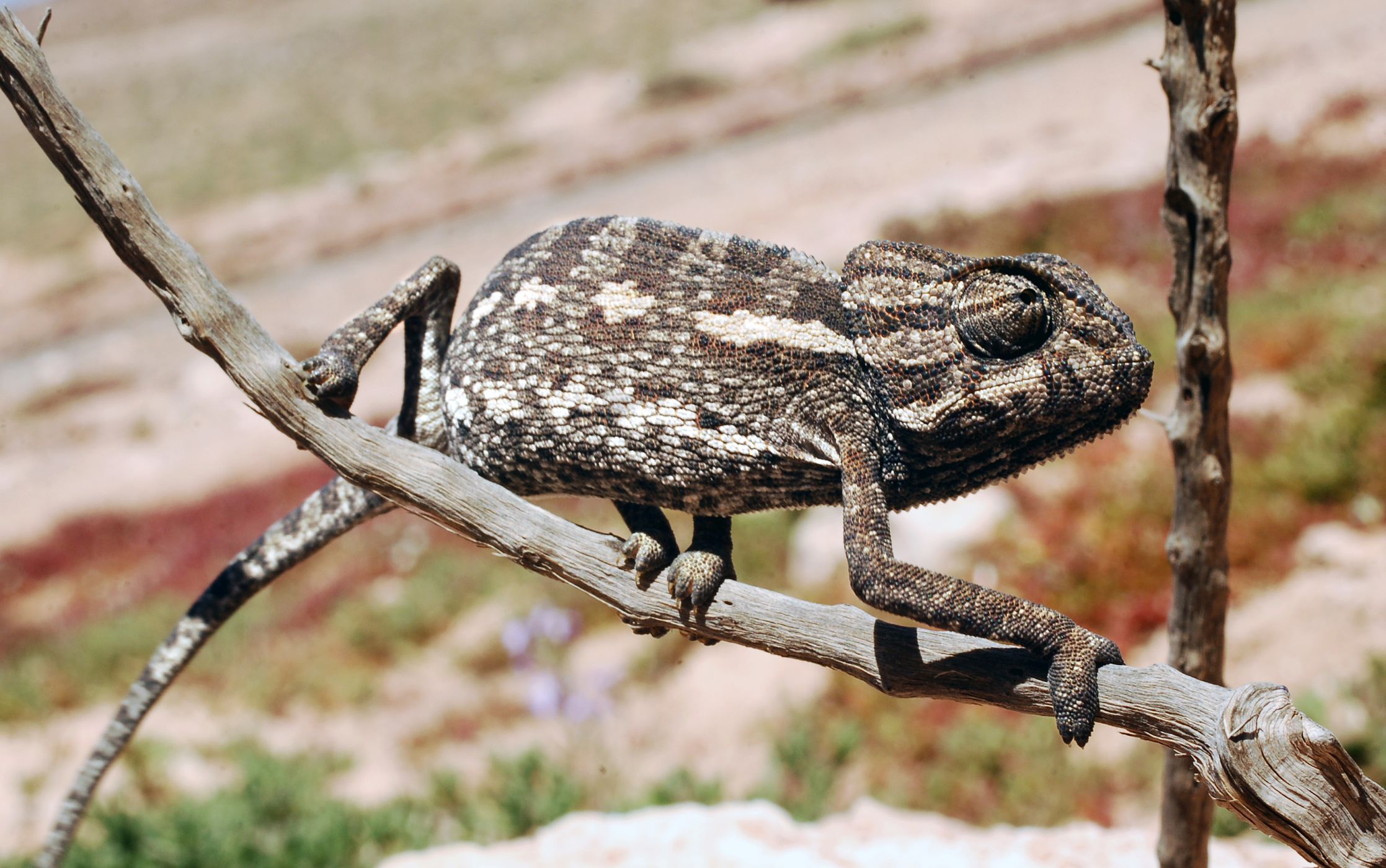 • Chameleon obecný ve volné přírodě marocké části Sahary. Objevit ho, je opravdu spíše dílem náhody, a o to cennější je tento portrét.