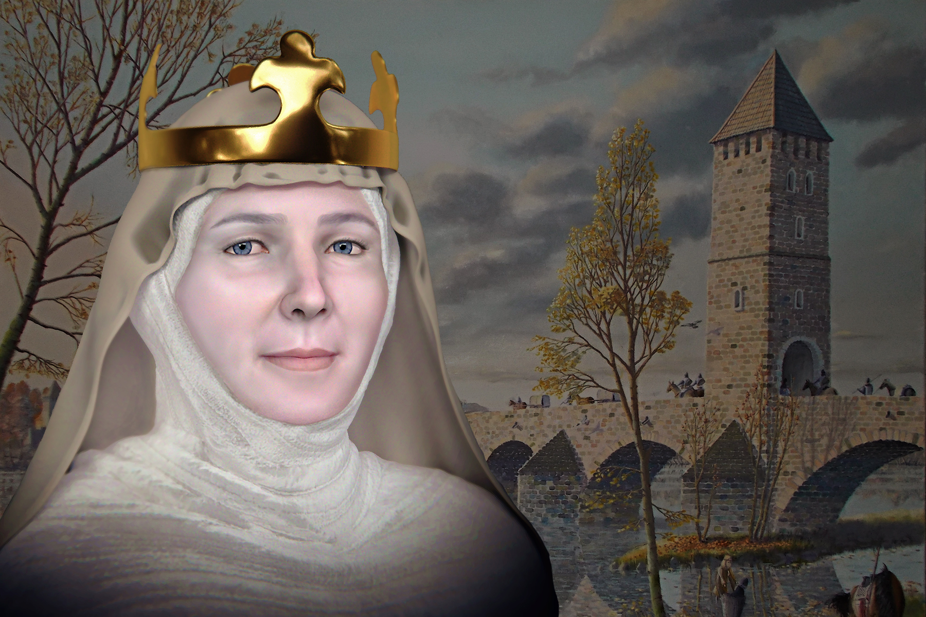 Judita Durynská – narodila se zhruba kolem roku 1135, zemřela někdy po roce 1210. Rekonstrukce podoby Judity podle kosterních pozůstatků lebky. V pozadí představa podoby Juditina mostu na obraze od Lubomíra Herce. (foto: Wikimedia Commons, Cicero Moraes, CC BY-SA 4.0)