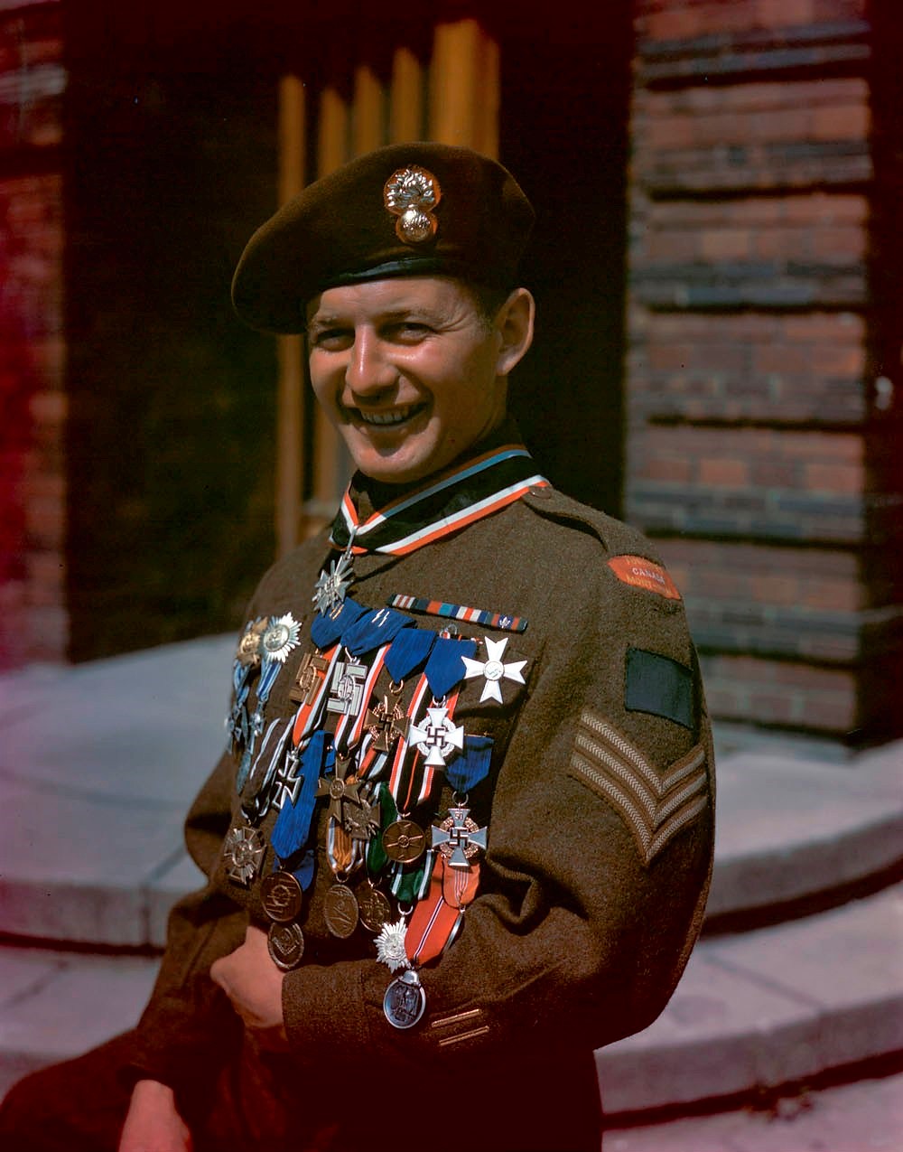 Seržant Gerard Durocher, příslušník kanadského záložního pěšího praporu Les Fusiliers Mont-Royal (součást 6. pěší brigády 2. kanadské divize), pózuje se svými válečnými suvenýry, které si pořídil v dobytém Berlíně – právě tam tento snímek 19. července 1945 vznikl.