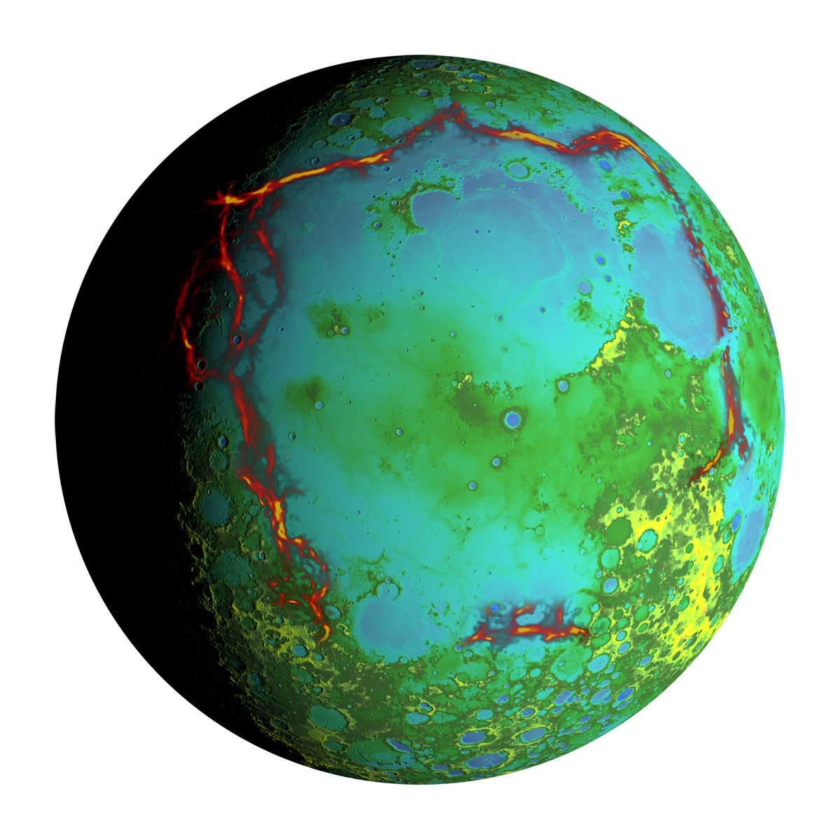 Na topografické mapě Měsíce jsou červeně zvýrazněny příkopové propadliny lemující celý Oceán bouří