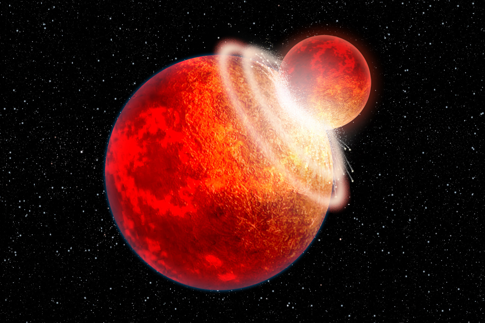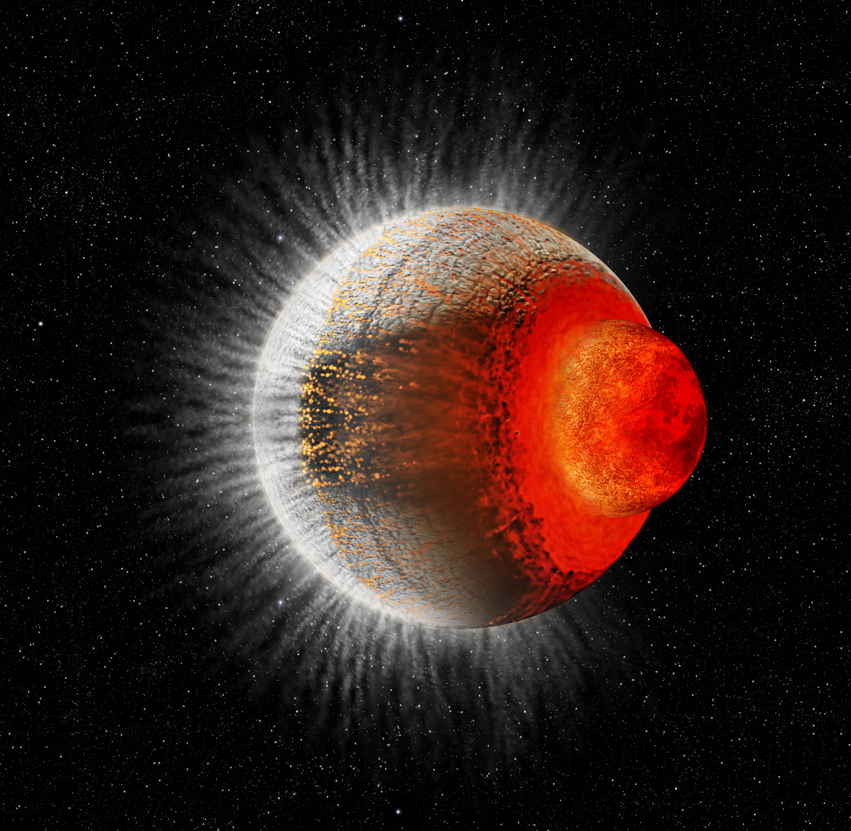 Měsíc nejspíš nevznikl jako následek šikmého impaktu, jak se předpokládalo dřív, nýbrž po přímém zásahu s mnohem větší razancí (kresba: Pavel Gabzdyl)