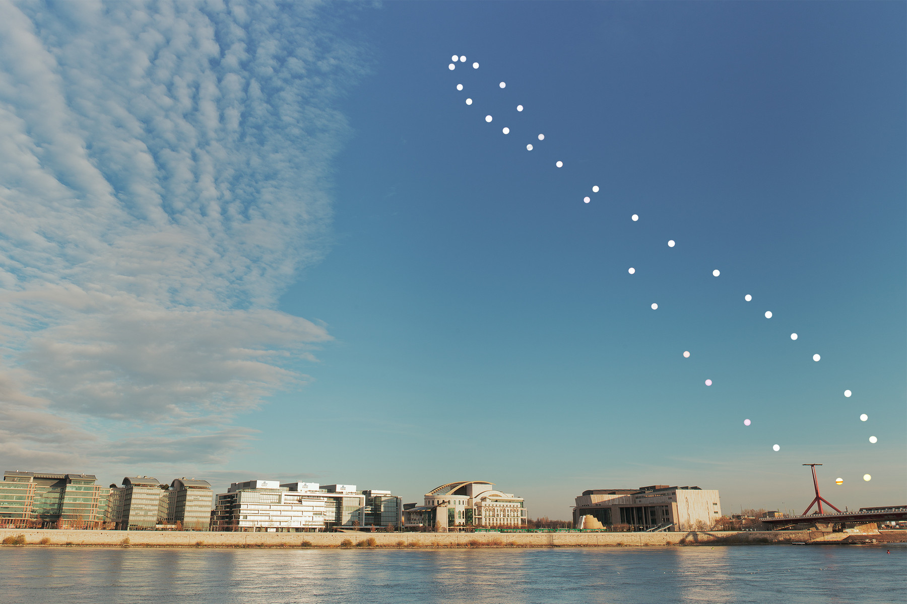 Zachycená analema je výsledkem časosběrného snímkování v průběhu několika měsíců. Pohled ze břehu Dunaje zobrazuje kancelářské budovy, Maďarské národní divadlo, palác umění a východní pilíře Lágymáňošškého mostu v Budapešti. (foto: Flickr, György Soponyai, CC BY-NC 2.0)