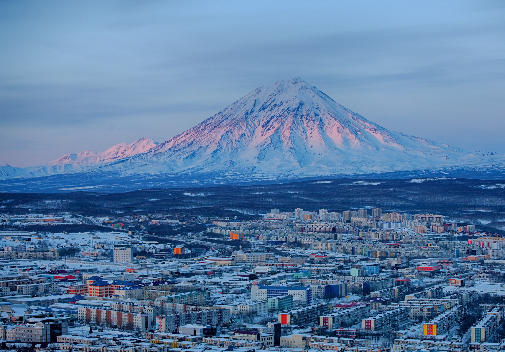 Pohled na město Petropavlovsk-Kamčatskij, které má zhruba 180 tisíc obyvatel. Nejvýraznějším kuželem v pozadí je Korjacká sopka.