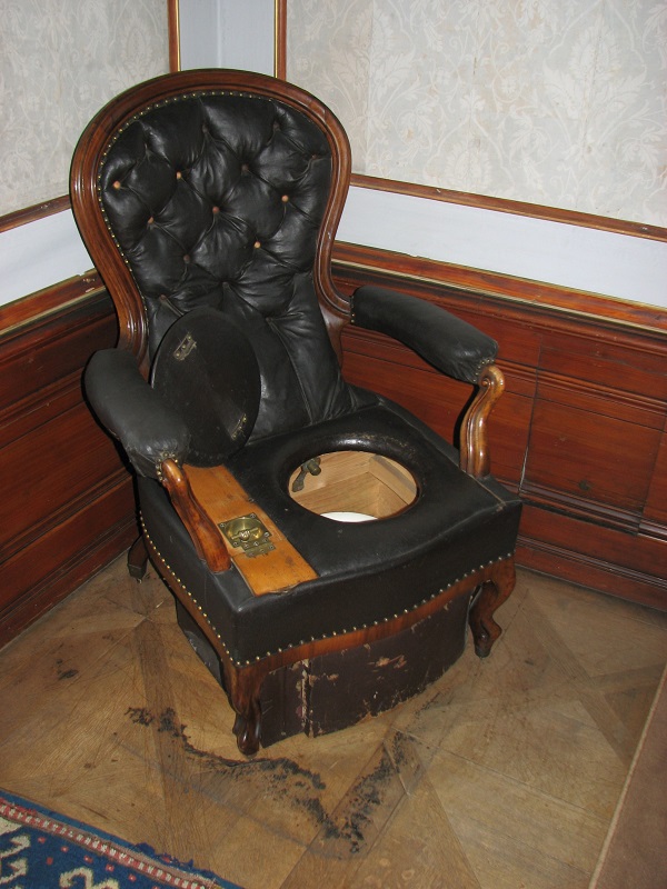 Hygienické křeslo císaře Ferdinanda potažené kůží se zabudovaným nočníkem a nádržkou na splachování