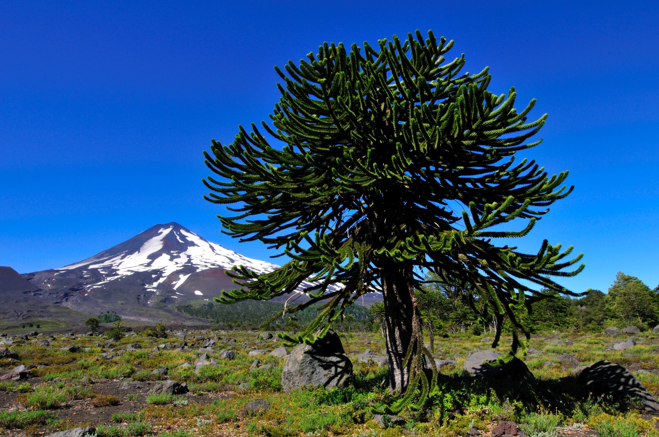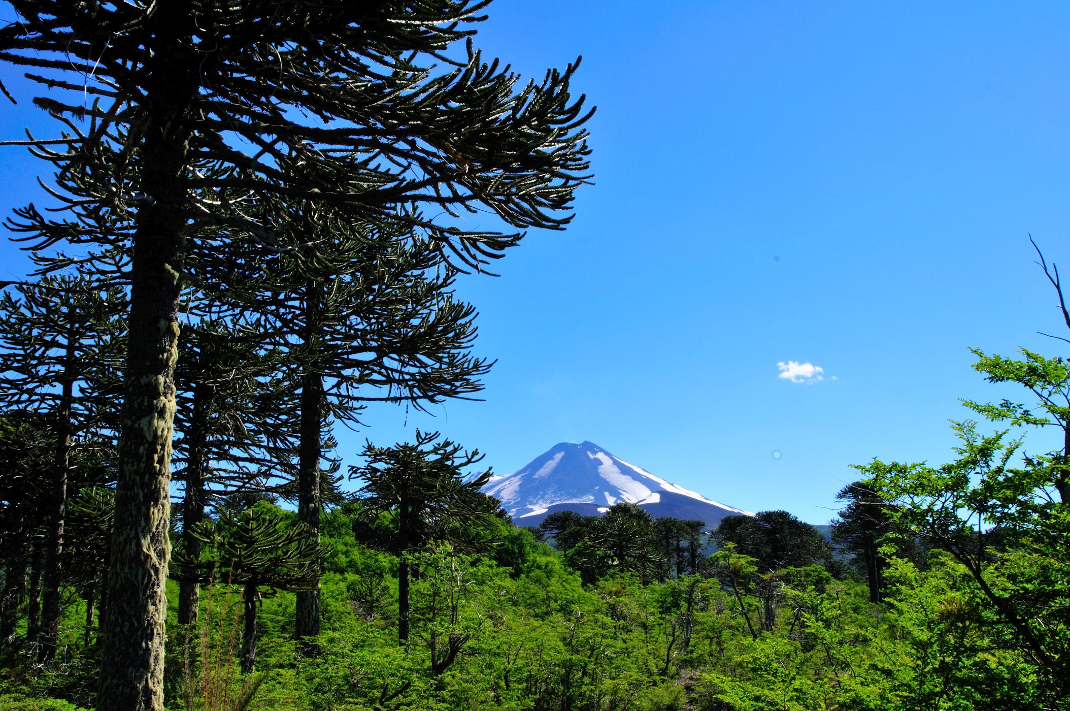 Les araukárií a v pozadí 3 125 metrů vysoký vrchol Llaima