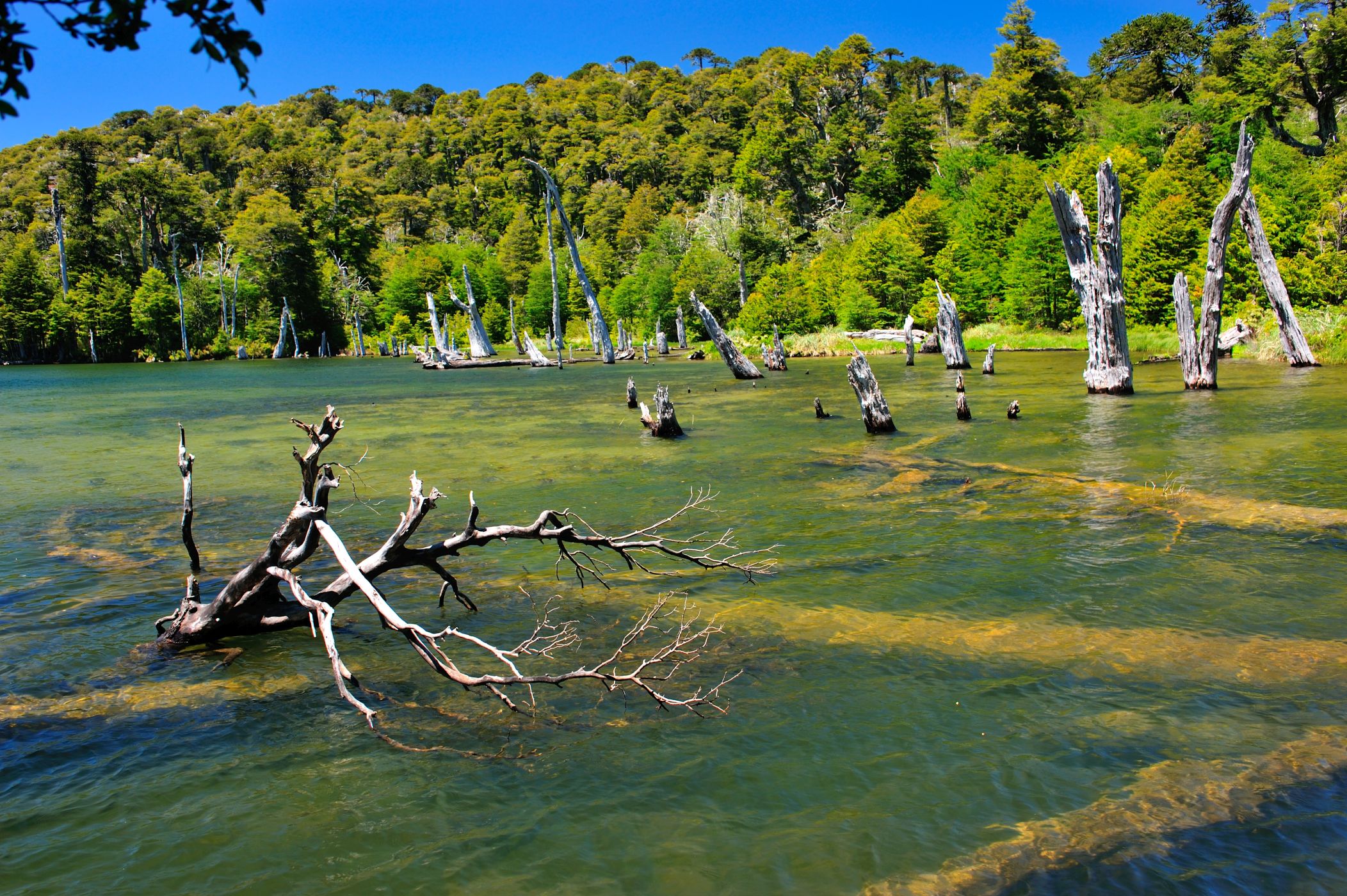 Pod hladinou zdejších jezer jsou vidět pahýly výbuchem zničených stromů