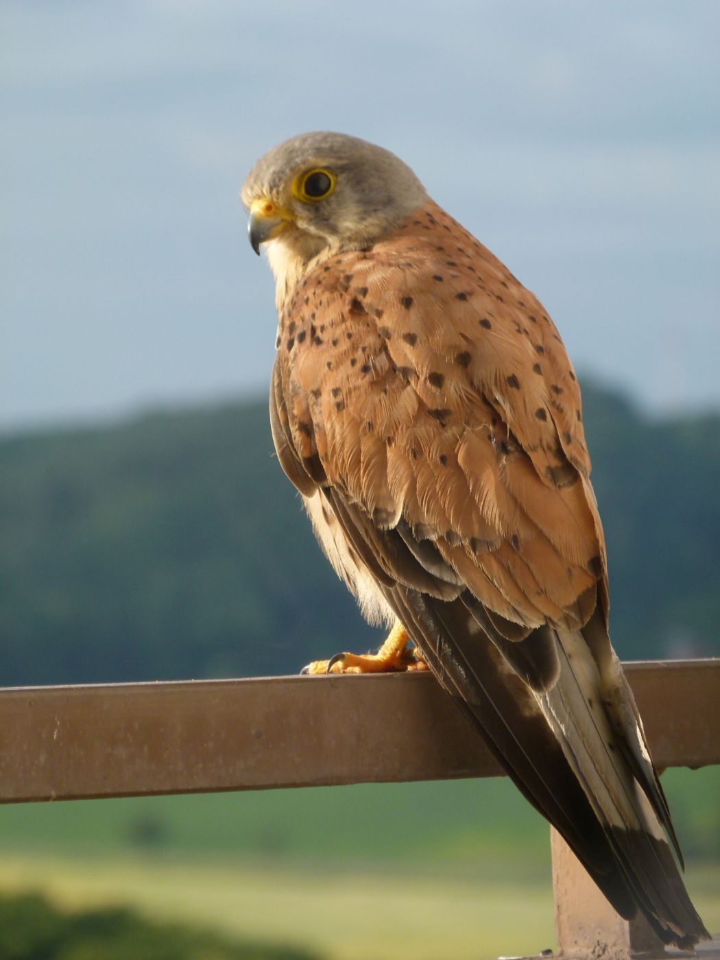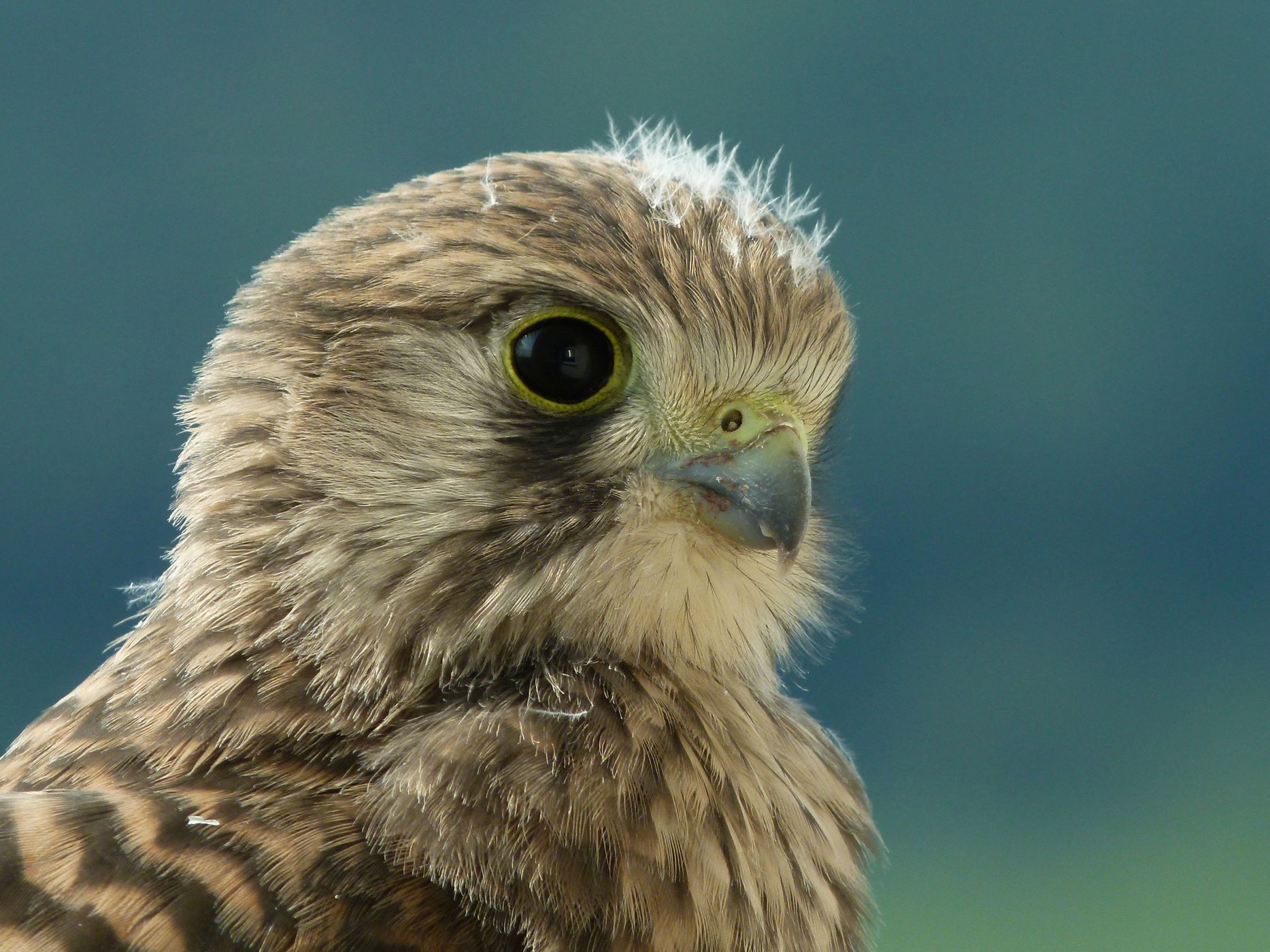 Přepeřená mladá poštolka obecná se zbytky prachového peří na hlavě